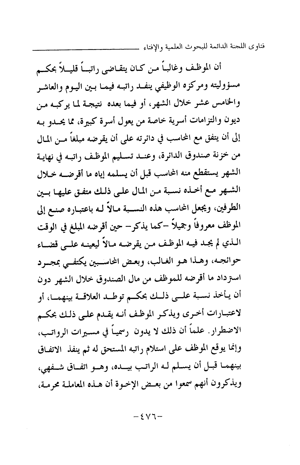 أن الموظف وغالبا من كان يتقاضى راتبا قليلا بحكم مسؤوليته ومركزه الوظيفي ينفد راتبه فيما بين اليوم والعاشر والخامس عشر خلال الشهر، أو فيما بعده نتيجة لما يركبه من ديون والتزامات أسرية خاصة من يعول أسرة كبيرة، مما يحدو به إلى أن يتفق مع المحاسب في دائرته على أن يقرضه مبلغا من المال من خزنة صندوق الدائرة، وعند تسليم الموظف راتبه في نهاية الشهر يستقطع منه المحاسب قبل أن يسلمه إياه ما أقرضه خلال الشهر مع أخذه نسبة من المال على ذلك متفق عليها بين الطرفين، ويجعل المحاسب هذه النسبة مالا له باعتباره صنع إلى الموظف معروفا وجميلا- كما يذكر- حين أقرضه المبلغ في الوقت الذي لم يجد فيه الموظف من يقرضه مالا ليعينه على قضاء حوائجه، وهذا هو الغالب، وبعض المحاسبين يكتفي بمجرد استرداد ما أقرضه للموظف من مال الصندوق خلال الشهر دون أن يأخذ نسبة على ذلك بحكم توطد العلاقة بينهما، أو لاعتبارات أخرى، ويذكر الموظف أنه يقدم على ذلك بحكم الاضطرار. علما أن ذلك لا يدون رسميا في مسيرات الرواتب، وإنما يوقع الموظف على استلام راتبه المستحق له ثم ينفذ الاتفاق بينهما قبل أن يسلم له الراتب بيده، وهو اتفاق شفهي، ويذكرون أنهم سمعوا من بعض الإخوة أن هذه المعاملة محرمة،