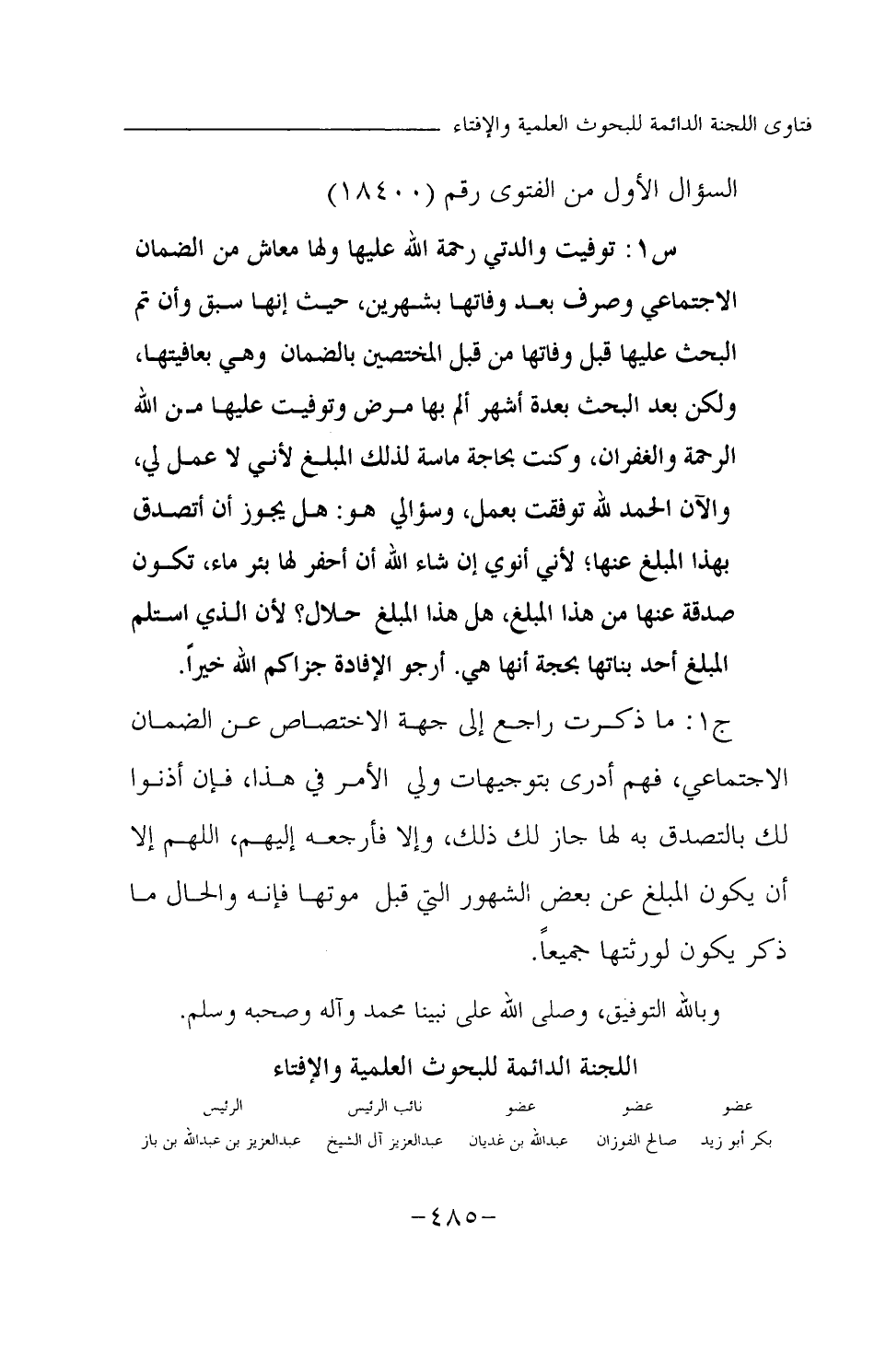 ج1: ما ذكرت راجع إلى جهة الاختصاص. عن الضمان الاجتماعي، فهم أدرى بتوجيهات ولي الأمر في هذا، فإن أذنوا لك بالتصدق به لها جاز لك ذلك، وإلا فأرجعه إليهم، اللهم إلا أن يكون المبلغ عن بعض الشهور التي قبل موتها فإنه والحال ما ذكر يكون لورثتها جميعا.
