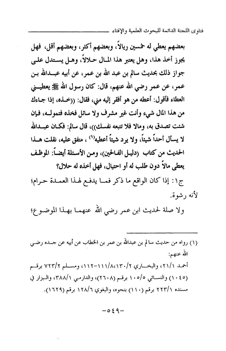 بعضهم يعطي له خمسين ريالا، وبعضهم أكثر، وبعضهم أقل، فهل يجوز أخذ هذا، وهل يعتبر هذا المال حلالا، وهل يستدل على جواز ذلك بحديث سالم بن عبد الله بن عمر، عن أبيه عبد الله بن عمر، عن عمر رضي الله عنهم، قال: «كان رسول الله صلى الله عليه وسلم يعطيني العطاء فأقول: أعطه من هو أفقر إليه مني، فقال: " خذه،، إذا جاءك من هذا المال شيء وأنت غير مشرف ولا سائل، فخذه فتموله، فإن شئت تصدق به، وما لا فلا تتبعه نفسك، قال سالم: فكان عبد الله لا يسأل أحدا شيئا، ولا يرد شيئا أعطيه» متفق عليه، نقلت هذا الحديث من كتاب (دليل الفالحين) ، ومن الأسئلة أيضا: الموظف يعطى مالا دون طلب له أو احتيال، فهل أخذه له حلال؟