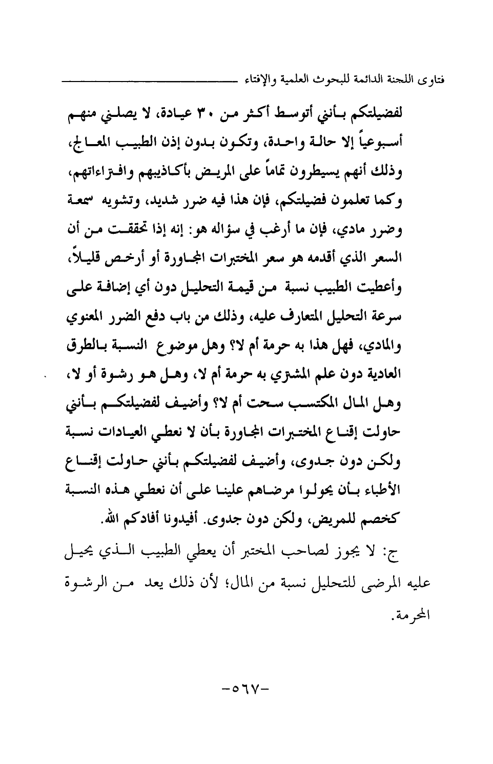 ج: لا يجوز لصاحب المختبر أن يعطي الطبيب الذي يحيل عليه المرضى للتحليل نسبة من المال؛ لأن ذلك يعد من الرشوة المحرمة.