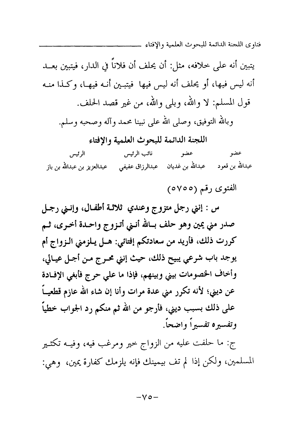 س: إنني رجل متزوج وعندي ثلاثة أطفال، وإنني رجل صدر مني يمين وهو حلف بالله أنني أتزوج واحدة أخرى، ثم كررت ذلك، فأريد من سعادتكم إفتائي: هل يلزمني الزواج أم يوجد باب شرعي يبيح ذلك، حيث إنني محرج من أجل عيالي، وأخاف الخصومات بيني وبينهم، فإذا ما علي حرج فأبغي الإفادة عن ديني؛ لأنه تكرر مني عدة مرات، وأنا إن شاء الله عازم قطعيا على ذلك بسبب ديني، فأرجو من الله ثم منكم رد الجواب خطيا وتفسيره تفسيرا واضحا.