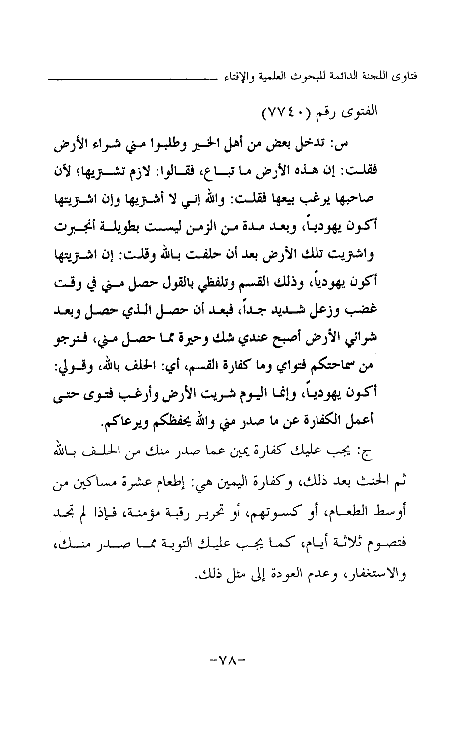 س: تدخل بعض من أهل الخير وطلبوا مني شراء الأرض، فقلت: إن هذه الأرض ما تباع، فقالوا: لازم تشتريها؛ لأن صاحبها يرغب بيعها، فقلت: والله إني لا أشتريها وإن اشتريتها أكون يهوديا، وبعد مدة من الزمن ليست بطويلة أنجبرت واشتريت تلك الأرض بعد أن حلفت بالله وقلت: إن اشتريتها أكون يهوديا، وذلك القسم وتلفظي بالقول حصل مني في وقت غضب وزعل شديد جدا، فبعد أن حصل الذي حصل، وبعد شرائي الأرض أصبح عندي شك وحيرة مما حصل مني، فنرجو من سماحتكم فتواي، وما كفارة القسم، أي: الحلف بالله، وقولي: أكون يهوديا، وإنما اليوم شريت الأرض وأرغب فتوى حتى أعمل الكفارة عن ما صدر مني، والله يحفظكم ويرعاكم.