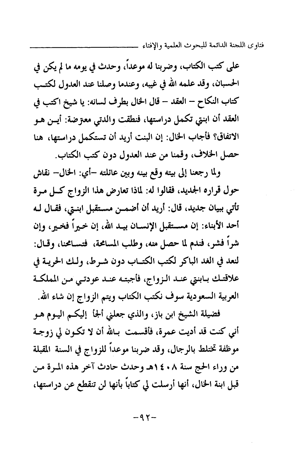 فضيلة الشيخ ابن باز، والذي جعلني ألجأ إليكم اليوم هو أني كنت قد أديت عمرة، فأقسمت بالله أن لا تكون لي زوجة موظفة تختلط بالرجال، وقد ضربنا موعدا للزواج في السنة المقبلة من وراء الحج سنة 1408هـ، وحدث حادث آخر هذه المرة من قبل ابنة الخال، أنها أرسلت لي كتابا بأنها لن تنقطع عن دراستها،