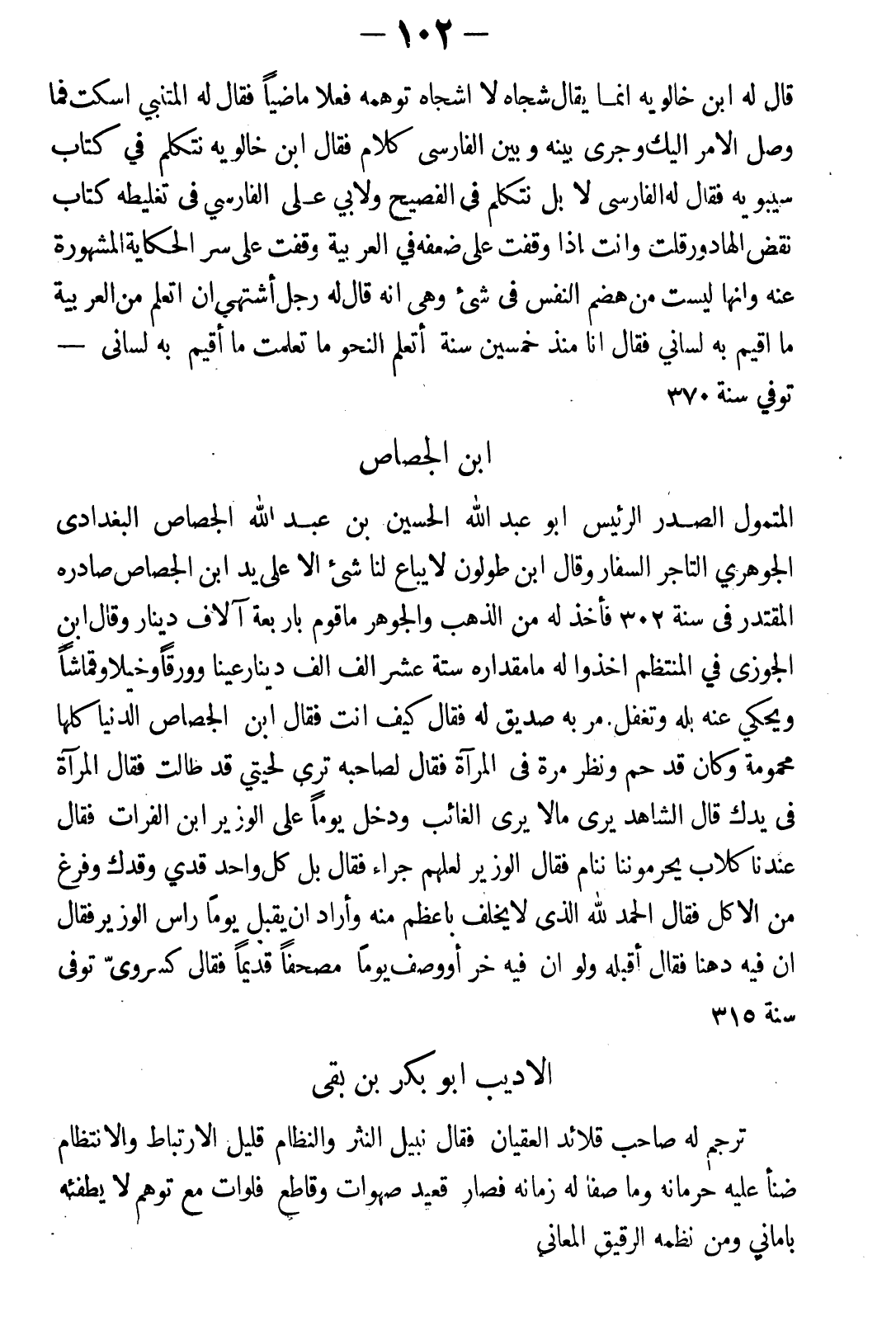 نتكلم في كتاب سيبويه. فقال له الفارسي: لا بل نتكلم في الفصيح. ولأبي على الفارسي في تغليطه كتاب نقض الهادور قلت: وأنت إذا وقفت على ضعفه في العربية وقفت على سر الحكاية المشهورة عنه وإنها ليست من هضم النفس في شيء، وهي إنه قال له رجل: أشتهي أن أتعلم من العربية ما أقيم به لساني. فقال: أنا منذ خمسين سنة أتعلم النحو ما تعلمت ما أقيم به لساني. توفي سنة 370.