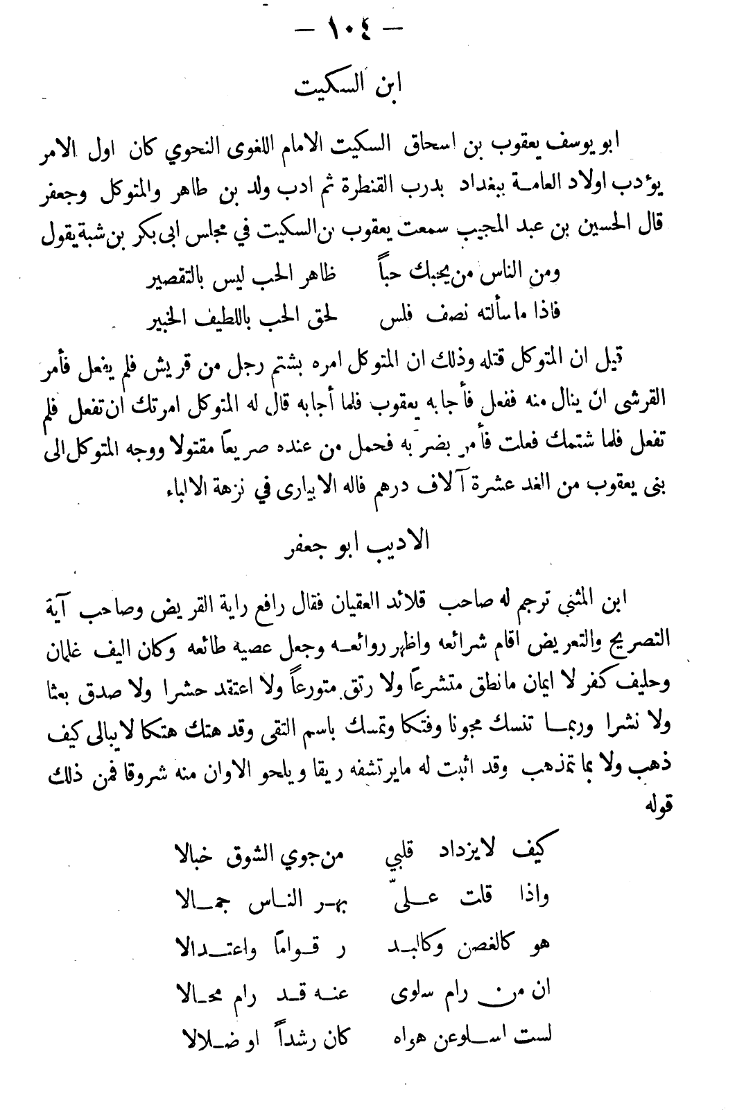 أبو يوسف يعقوب بن إسحاق بن السكيت الإمام اللغوي النحوي، كان أول الأمر يؤدب أولاد العامة ببغداد بدرب القنطرة، ثم أدب ولدا بن طاهر والمتوكل وجعفر. قال الحسين بن عبد المجيب: سمعت يعقوب بن السكيت في مجلس أبي بكر بن شبة يقول: