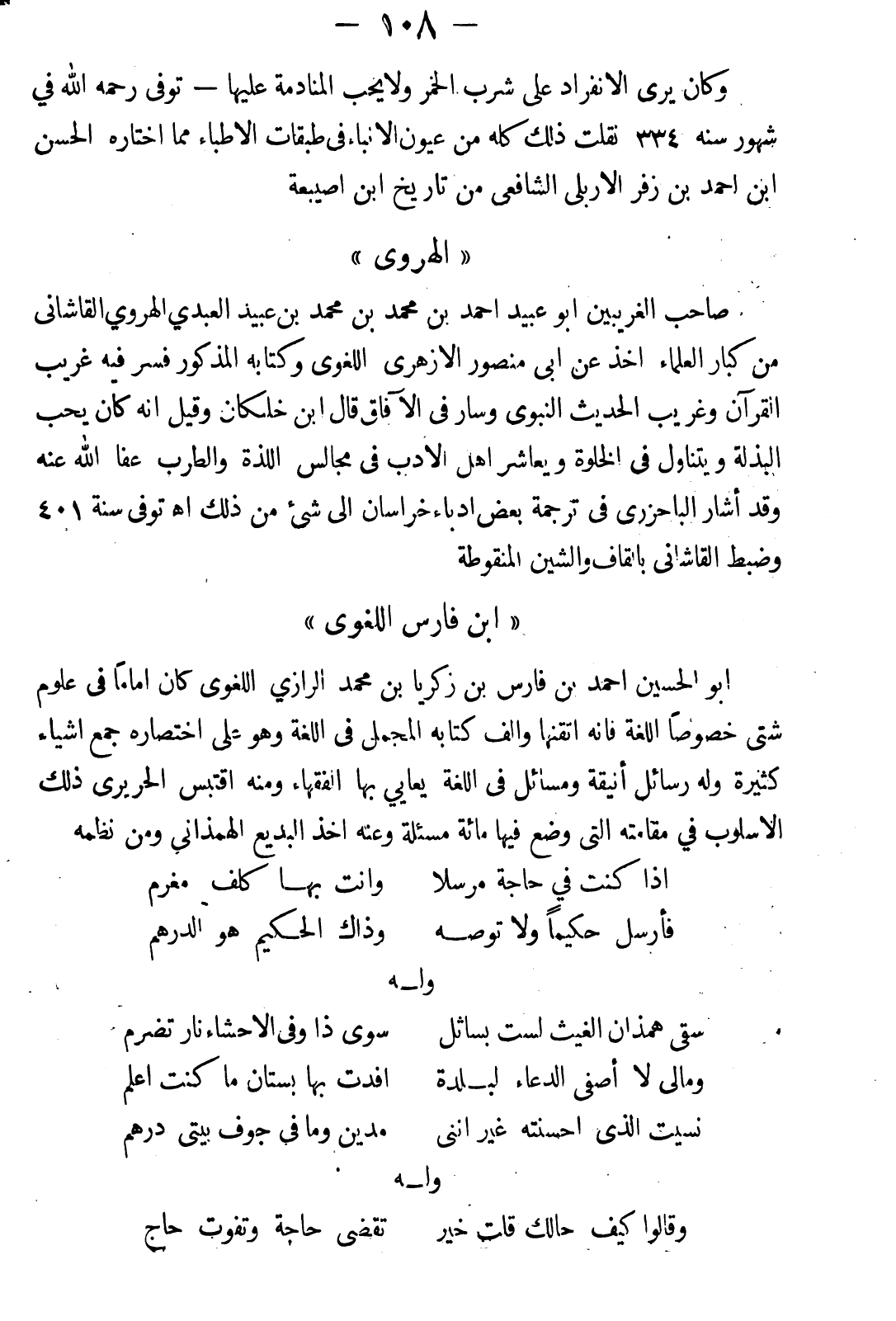أبو الحسين أحمد بن فارس بن زكريا بن محمد الرازي اللغوي، كان إماما في علوم شتى خصوصا اللغة فإنه أتقنها وألف كتابه المجمل في اللغة، وهو على اختصاره جمع أشياء كثيرة، وله رسائل أنيقة ومسائل في اللغة يعايي بها الفقهاء، ومنه اقتبس الحريري ذلك الأسلوب في مقامته التي وضع فيها مائة مسألة وعنه اخذ البديع الهمذاني، ومن نظمه: