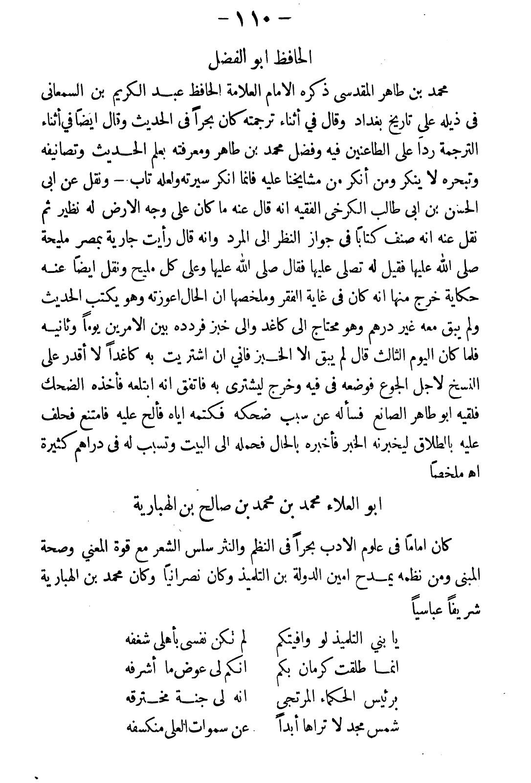 محمد بن طاهر المقدسي، ذكره الإمام العلامة الحافظ عبد الكريم ابن السمعانى في ذيله على تاريخ بغداد وقال في أثناء ترجمته: كان بحرا في الحديث. وقال أيضا في أثناء الترجمة ردا على الطاعنين فيه: وفضل محمد بن طاهر ومعرفته بعلم الحديث وتصانيفه وتبحره لا ينكر، ومن أنكر من مشايخنا عليه فإنما أنكر سيرته ولعله تاب. ونقل عن أبي الحسن بن أبي طالب الكرخي الفقيه إنه قال عنه: ما كان على وجه الأرض له نظير. ثم نقل عنه إنه صنف كتابا في جواز النظر إلى المراد وإنه قال: رأيت جارية بمصر مليحة صلى الله عليها. فقيل له: تصلى عليها؟ فقال: صلى الله عليها وعلى كل مليح. ونقل أيضا عنه حكاية خرج منها إنه كان في غاية الفقر، وملخصها أن الحال أعوزته وهو يكتب الحديث ولم يبق معه غير درهم وهو محتاج إلى كاغد وإلى خبز، فردده بين الأمرين يوما وثانيه، فلما كان اليوم الثالث قال: لم يبق إلا الخبز فإني إن اشتريت به كاغدا لا أقدر على النسخ لأجل الجوع، فوضعه في فيه وخرج ليشتري به فاتفق إنه ابتلعه فأخذه الضحك، فلقيه أبو طاهر الصانع فسأله عن سبب ضحكه فكتمه إياه، فألح عليه فامتنع فحلف عليه بالطلاق ليخبرنه الخبر، فأخبره بالحال فحمله إلى البيت وتسبب له في دراهم كثيرة - اهـ ملخصا