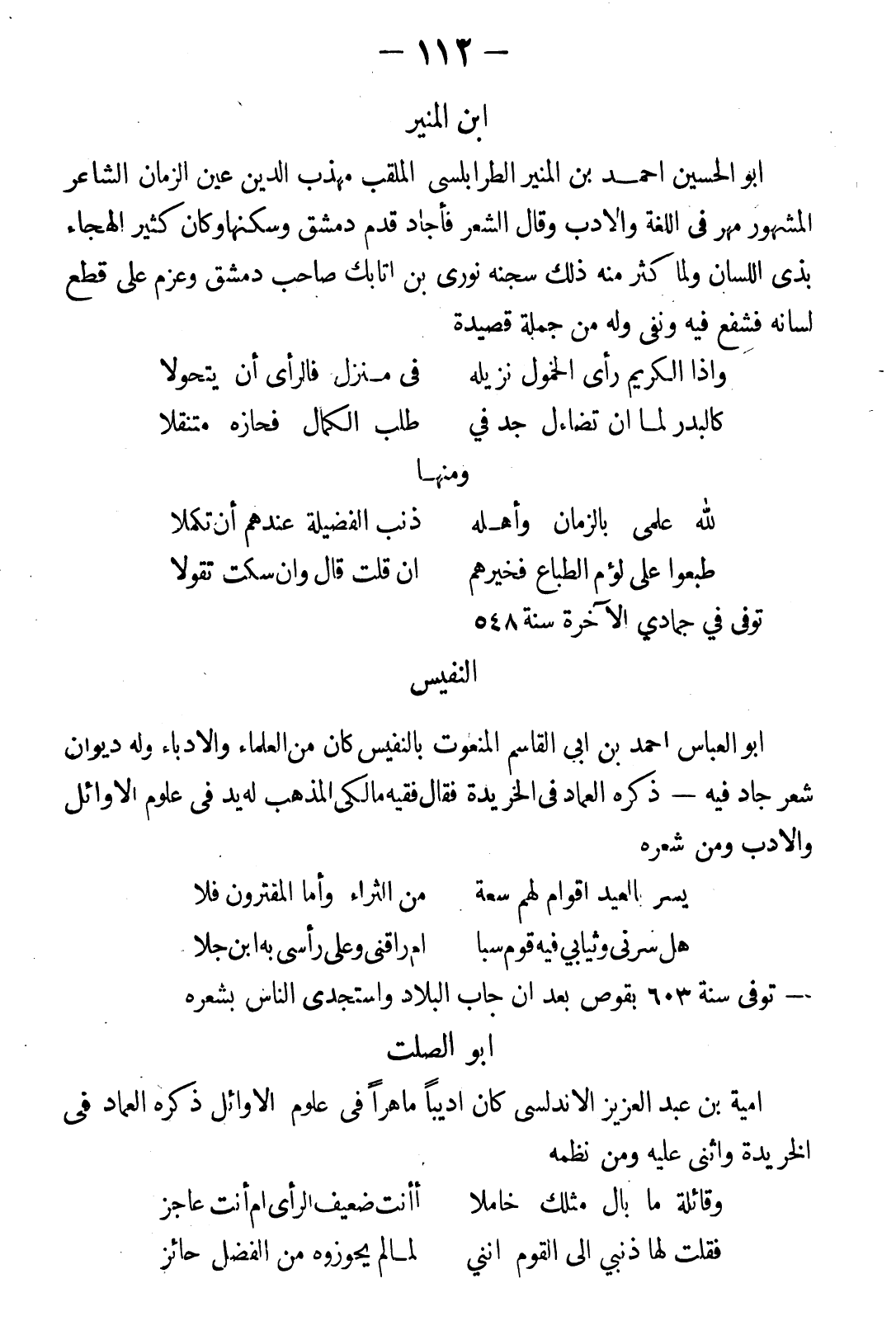 أبو الحسين أحمد بن المنير الطرابلسي الملقب مهذب الدين عين الزمان الشاعر المشهور، مهر في اللغة والأدب وقال الشعر فأجاد، قدم دمشق وسكنها وكان كثير الهجاء بذئ اللسان، ولما كثر منه سجنه نورى ابن أتابك صاحب دمشق وعزم على قطع لسانه، فشفع فيه ونفى، وله من جملة القصيدة: