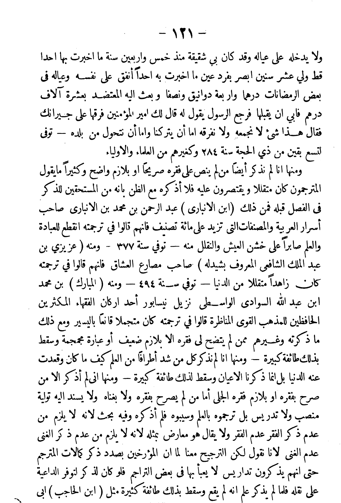 (ومنها) أني لم أذكر إلا من صرح بفقرة أو بلازم فقره الجلي، أما من لم يصرح بفقره ولا بغناه ولا يسند إليه تولية منصب ولا تدريس بل ترجموه بالعلم وسيبوه فلم أذكره. وفيه بحث لأنه لا يلزم من عدم ذكر الفقر عدم الفقر، ولا يقال هو معارض بمثله لأنه لا يلزم من عدم ذكر الغنى عدم الغنى، لأنا نقول: لكن الترجيح معنا، لما أن المؤرخين بصدد ذكر كمالات المترجم، حتى أنهم يذكرون تداريس لا يعبأ بها في بعض التراجم، فلو كان الذكر لتوفر الداعية على نقله فلما لم يذكر علم إنه لم يقع وسقط بذلك طائفة كثيرة: