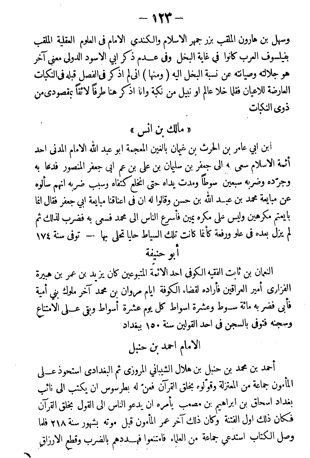 أحمد بن محمد بن حنبل بن هلال الشيباني المروزي ثم البغدادي استحوذ على المأمون جماعة من المعتزلة وقولوه بخلق القرآن، فعن له بطرسوس أن يكتب إلى نائب بغداد إسحاق بن إبراهيم بن مصعب يأمره أن يدعو لناس إلى القول بخلق القرآن، فكان ذلك أول الفتنة، وكان ذلك آخر عمر المأمون قبل موته بشهور سنة 218، فلما وصل الكتاب استدعى جماعة من العلماء فامتنعوا فهددهم بالضرب وقطع الأرزاق