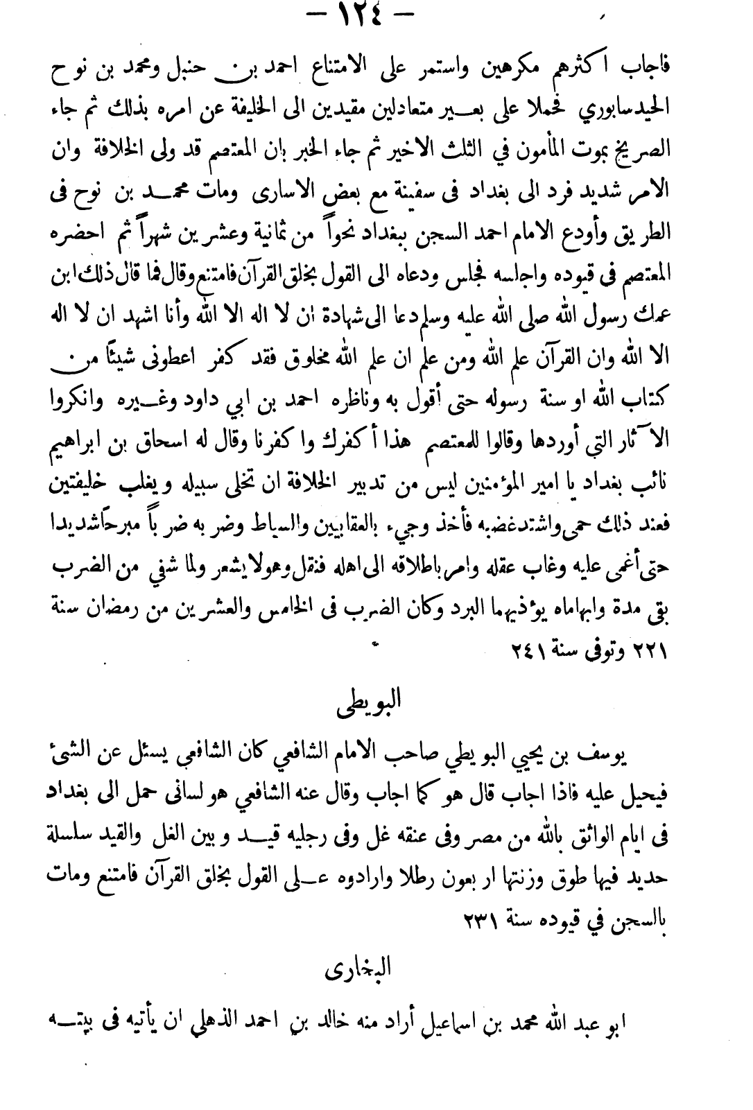 يوسف بن يحيى البويطي صاحب الإمام الشافعي، كان الشافعي يسأل عن الشيء فيحيل عليه فإذا أجاب قال: هو كما أجاب. وقال عنه الشافعي: هو لساني، حمل إلى بغداد في أيام الواثق بالله من مصر وفي عنقه غل وفي رجليه قيد، وبين الغل والقيد سلسلة حديد فيها طوق وزنتها أربعون رطلا، وأرادوه على القول بخلق القرآن فامتنع ومات بالسجن في قيوده سنة 231.