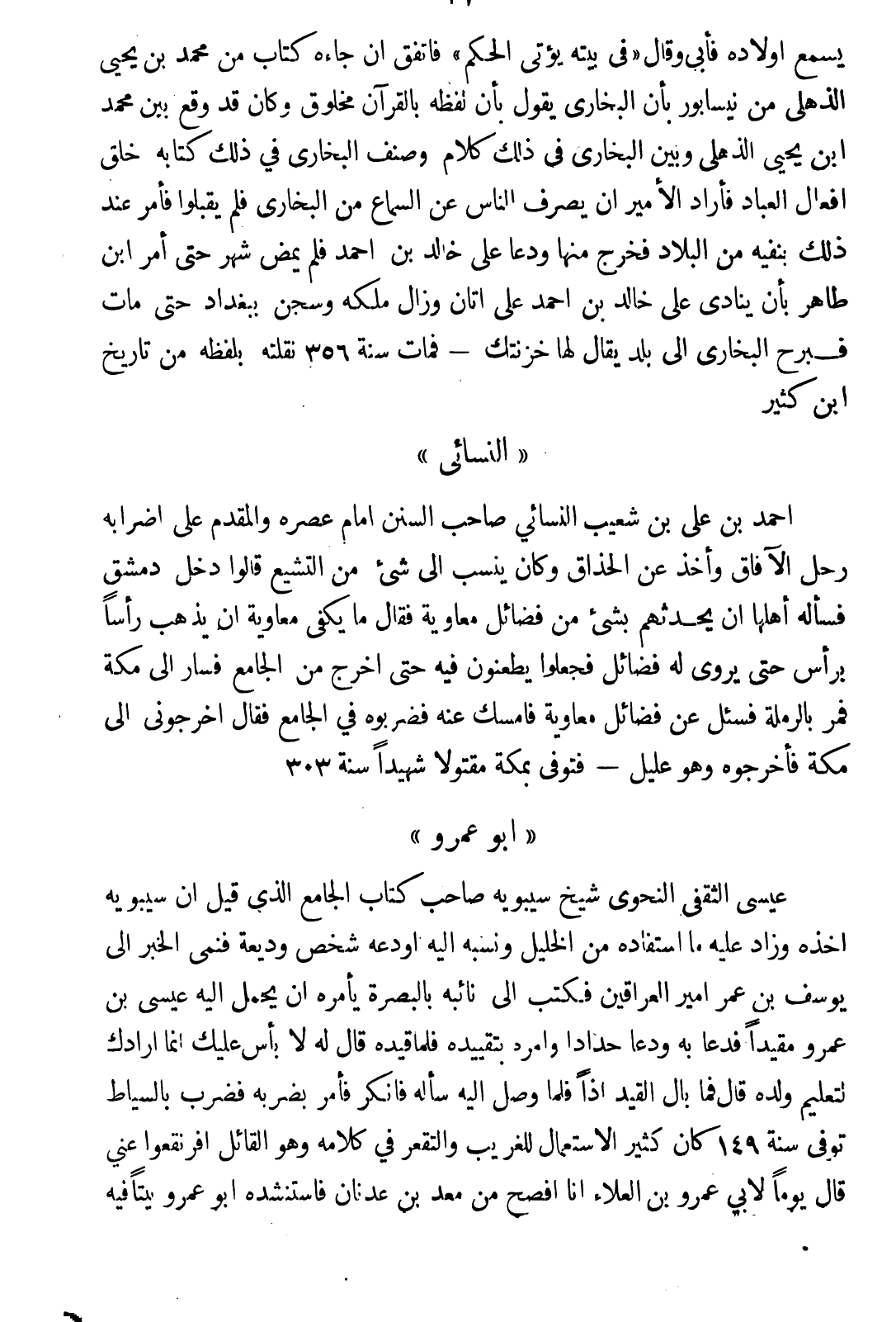 أحمد بن علي بن شعيب النسائي صاحب السنن، إمام عصره والمقدم على اضرابه، رحل الآفاق واخذ عن الحذاق، وكان ينسب إلى شيء من التشيع. قالوا: دخل دمشق فسأله أهلها أن يحدثهم بشيء من فضائل معاوية. فقال: ما يكفي معاوية أن يذهب رأسا برأس حتى يروى له فضائل، فجمعوا يطعنون فيه حتى