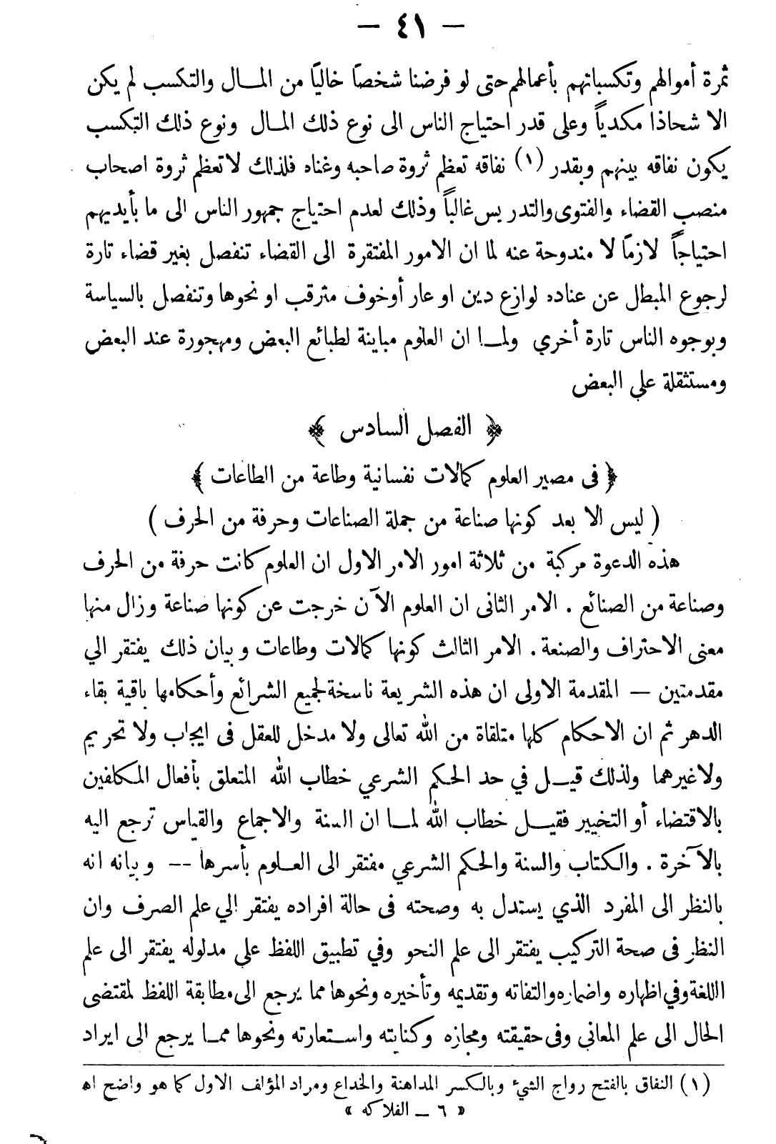 هذه الدعوة مركبة من ثلاثة أمور: (الأمر الأول) أن العلوم كانت حرفة من الحرف وصناعة من الصنائع. (الأمر الثاني) أن العلوم الآن خرجت عن كونها صناعة وزال منها معنى الاحتراف والصنعة. (الأمر الثالث) كونها كمالات وطاعات.