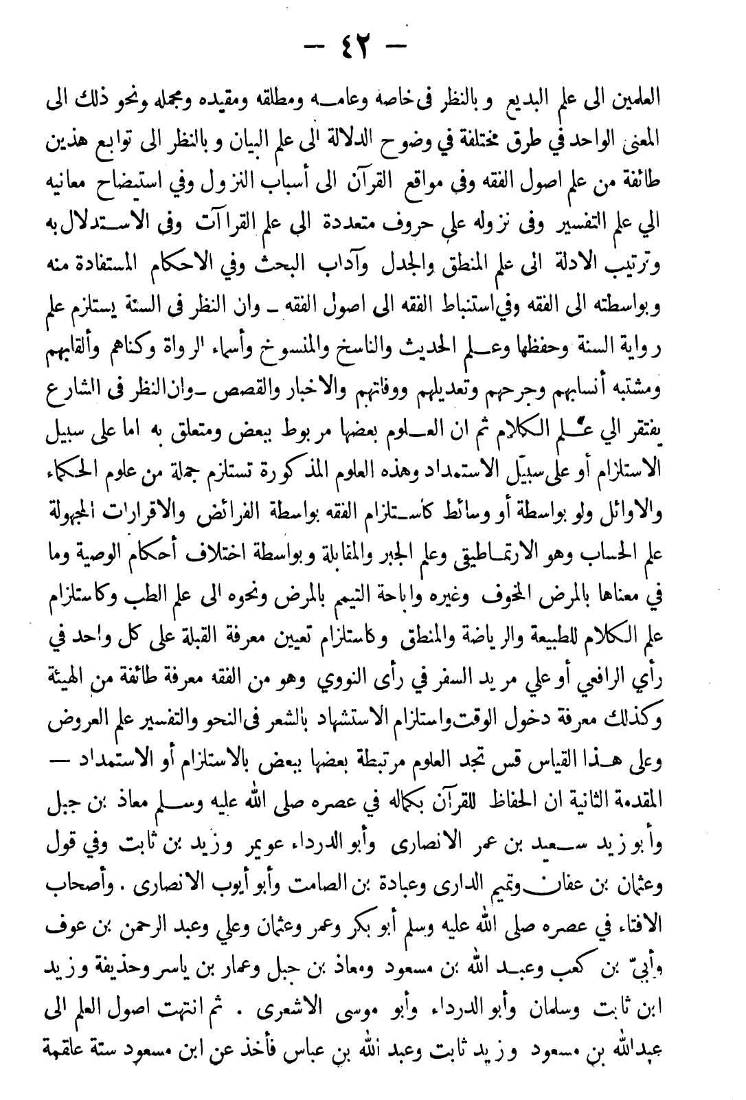 العلمين إلى علم البديع، وبالنظر في خاصه وعامه ومطلقه ومقيده ومجمله ونحو ذلك إلى المعنى الواحد في طرق مختلفة في وضوح الدلالة إلى علم البيان، وبالنظر إلى توابع هذين طائفة من علم أصول الفقه، وفي مواقع القرآن إلى أسباب النزول، وفي استيضاح معانيه إلى علم التفسير، وفي نزوله على حروف متعددة إلى علم القراءات، وفي الاستدلال به وترتيب الأدلة إلى علم المنطق والجدل وآداب البحث، وفي الأحكام المستفادة منه وبواسطته إلى الفقه، وفي استنباط الفقه إلى أصول الفقه، وان النظر في السنة يستلزم علم رواية السنة وحفظها وعلم الحديث والناسخ والمنسوخ وأسماء الرواة وكناهم وألقابهم ومشتبه أنسابهم وجرحهم وتعديلهم ووفاتهم والأخبار والقصص. وإن النظر في الشارع يفتقر إلى علم الكلام.