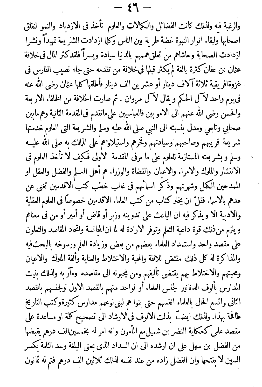 ثم صارت الخلافة من الخلفاء الأربعة والحسن رضي الله عنهم إلى الأمويين فالعباسيين على ما تقدم في المقدمة الثانية، وهم ما بين صحابي وتابعي ومدل بنسبته إلى النبي صلى الله عليه وسلم والشريعة التي العلوم خدمتها شريعة قريبهم وصاحبهم وسيادتهم وفخرهم، واستيلاؤهم على الممالك به صلى الله عليه وسلم وبشريعته المستلزمة للعلوم على ما مر في المقدمة الأولى فكيف لا تأخذ العلوم في الانتشار والملوك والأمراء والأعيان والقضاة والوزراء هم أهل العلم والفضل