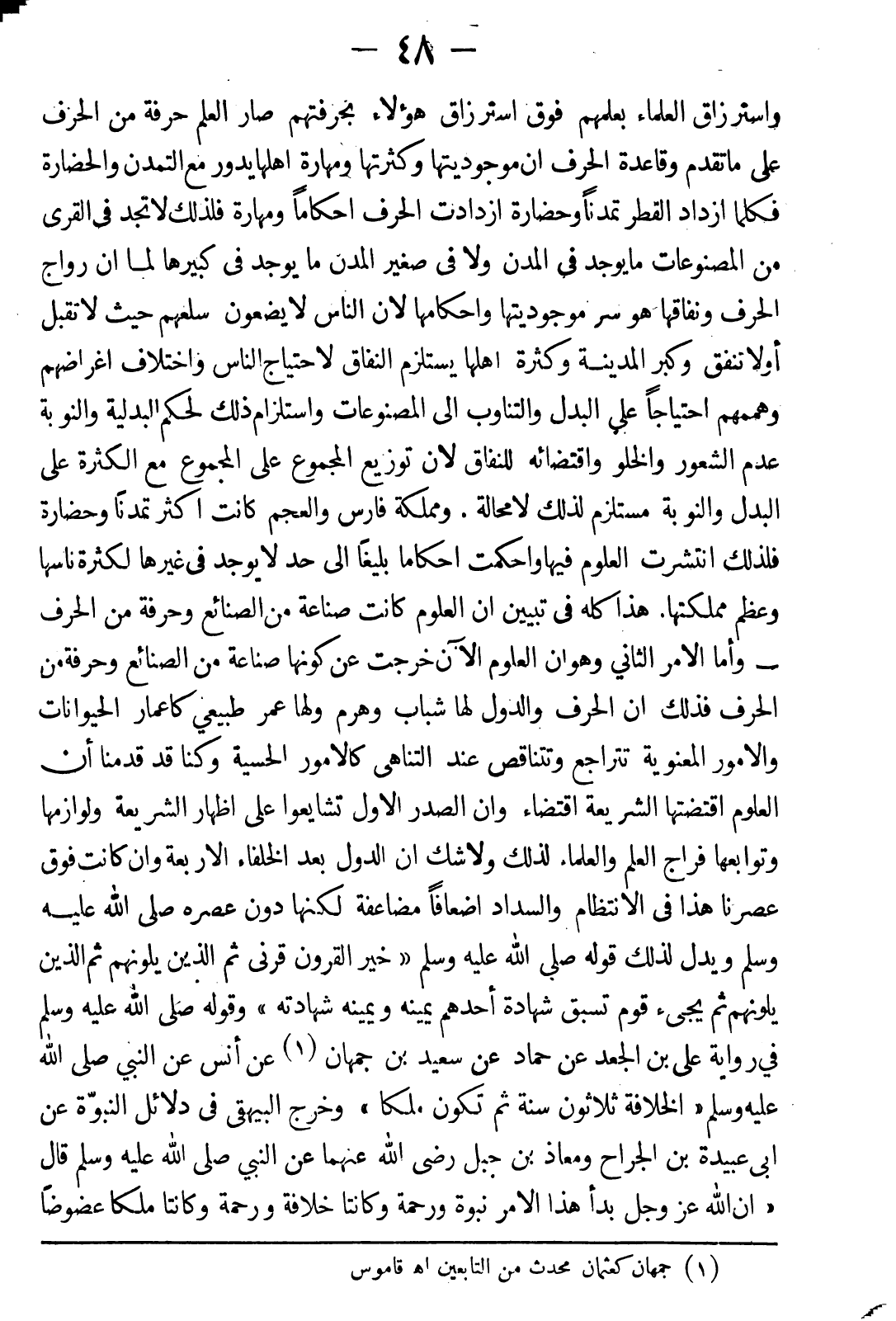 (وأما الأمر الثاني) وهو أن العلوم الآن خرجت عن كونها صناعة من الصنائع وحرفة من الحرف فذلك أن الحرف والدول لها شباب وهرم ولها عمر طبيعي كأعمار الحيوانات والأمور المعنوية تتراجع وتتناقص عند التناهي كالأمور الحسية، وكنا قد قدمنا أن العلوم اقتضتها الشريعة اقتضاءاً وإن الصدر الأول تشايعوا على إظهار الشريعة ولوازمها وتوابعها فراج العلم والعلماء لذلك، ولا شك أن الدول بعد الخلفاء الأربعة وان كانت فوق عصرنا هذا في الانتظام والسداد أضعافاً مضاعفة لكنها دون عصره صلى الله عليه وسلم، ويدل لذلك قوله صلى الله عليه وسلم: (خير القرون قرني ثم الذين يلونهم ثم الذين يلونهم ثم يجيء قوم تسبق شهادة أحدهم يمينه ويمينه شهادته) وقوله صلى الله عليه وسلم في رواية علي بن الجعد عن حماد عن سعيد بن جمهان عن أنس عن النبي صلى الله عليه وسلم: {الخلافة ثلاثون سنة ثم تكون ملكا}.