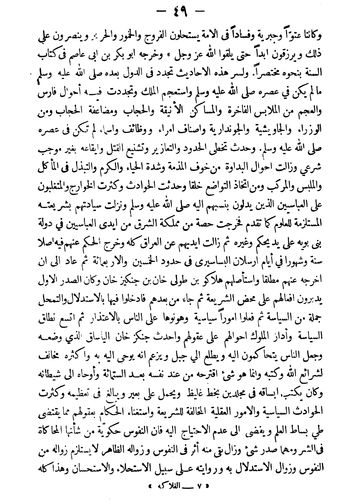 ولسر هذه الأحاديث تجدد في الدول بعده صلى الله عليه وسلم ما لم يكن في عصره صلى الله عليه وسلم واستعجم الملك، وتجددت فيه أحوال فارس والعجم من الملابس الفاخرة والمساكن الأنيقة والحجاب ومضاعفة الحجاب ومن الوزراء والجاويشية والجوندارية وأصناف أمراء ووظائف وأسماء لم تكن في عصره صلى الله عليه وسلم، وحدث تخطي الحدود والتعاويز وتشنيع القتل وإيقاعه بغير موجب شرعي، وزالت أحوال البداوة من خوف المذمة وشدة الحياء والكرم والتبذل في المأكل والملبس والمركب ومن اتخاذ التواضع خلقاً، وحدثت الحوادث وكثرت الخوارج والمتغلبون على العباسيين الذين يدلون بنسبهم إليه صلى الله عليه وسلم، ونزلت سيادتهم بشريعته المستلزمة للعلوم كما تقدم، فخرجت حصة من مملكة الشرق من أيدي العباسيين في دولة بني بويه على يد يحكم وغيره، ثم زالت أيديهم عن العراق كله، وخرج الحكم عنهم فيه أصلا سنة وشهوراً في أيام ارسلان البساسيري في حدود الخمسين والأربعمائة، ثم عاد إلى أن أخرجه عنهم مطلقاً واستأصلهم هلاكو بن طولى خان بني جنكيز خان.