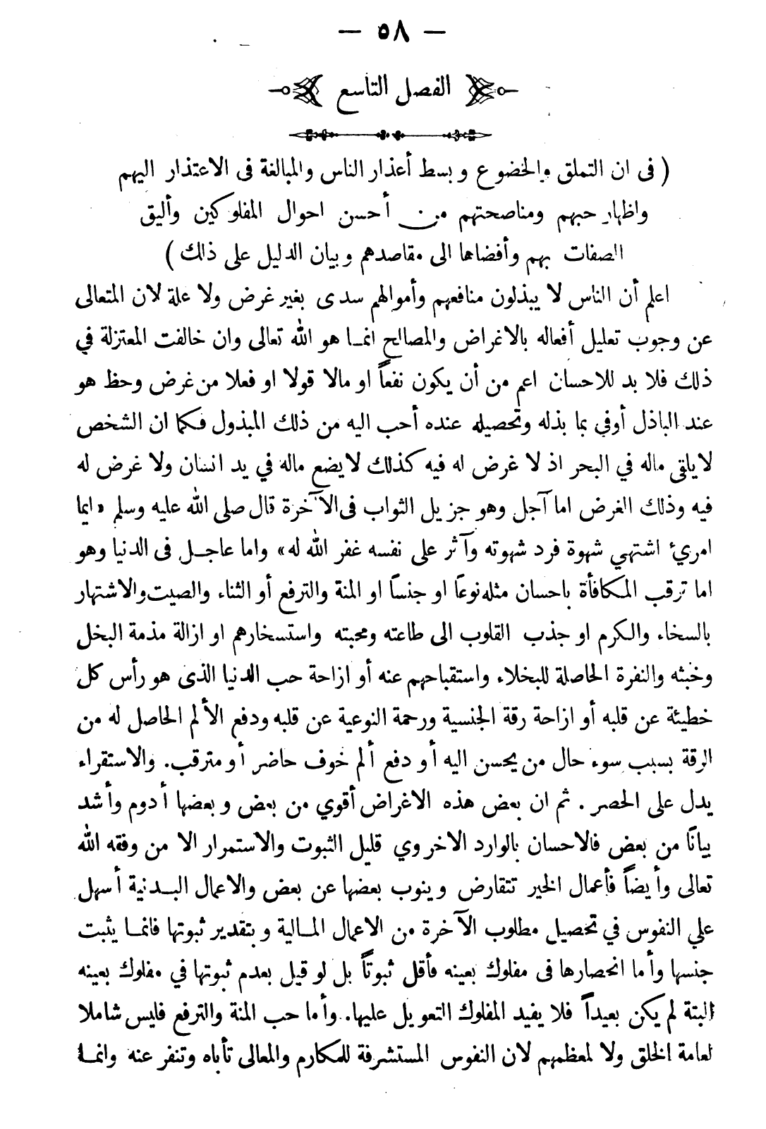 الثواب في الآخرة قال صلى الله عليه وسلم: {أيما امرئ اشتهى شهوة ر شهرته وآثر على نفسه غفر الله له}، وأما عاجل في الدنيا وهو إما ترقب المكافأة بإحسان مثله نوعاً أو جنساً، أو المنة والترفع، أو الثناء والصيت والاشتهار بالسخاء والكرم، أو جذب القلوب إلى طاعته ومحبته واستسخارهم. أو إزالة مذمة البخل وخبثه والنقرة الحاصلة للبخلاء واستقباحهم عنه، أو إزاحة حب الدنيا الذي هو رأس كل خطيئة عن قلبه، أو إزاحة رقة الجنسية ورحمة النوعية عن قلبه ودفع الألم الحاصل له من الرقة بسبب سوء حال من يحسن إليه، أو دفع ألم خوف حاضر أو مترقب. والاستقراء يدل على الحصر.