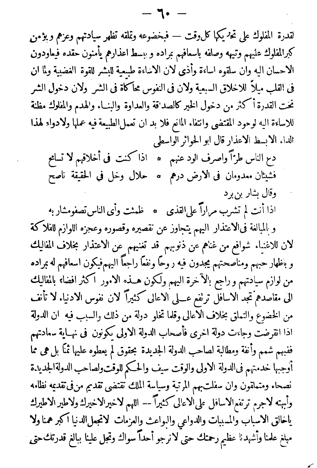 لقدرة على تحريكها كل وقت، فبخضوعه وتملقه تظهر سيادتهم وعزهم ويؤمن كبر المفلوك عليهم وتيهه وصلفه بإسعافهم بمراده، وببسط أعذارهم يأمنون حقده فيعاودون الإحسان إليه وإن سلقوه إساءة وأذى، لأن الإساءة طبيعية للبشر للقوة الغضبية، ولما أن في القلب ميلا للأخلاق السبعية، ولأن في النفوس محاكاة في الشر، ولأن دخول الشر تحت القدرة أكثر من دخول الخير كالصداقة والعداوة والبناء والهدم، والمفلوك مظنة للإساءة إليه لوجود المقتضى وانتفاء المانع، فلا بد أن تعمل الطبيعة فيه عملها، ولا دواء لهذا الداء إلا بسط الإعذار. قال أبو الحوائر الواسطي: