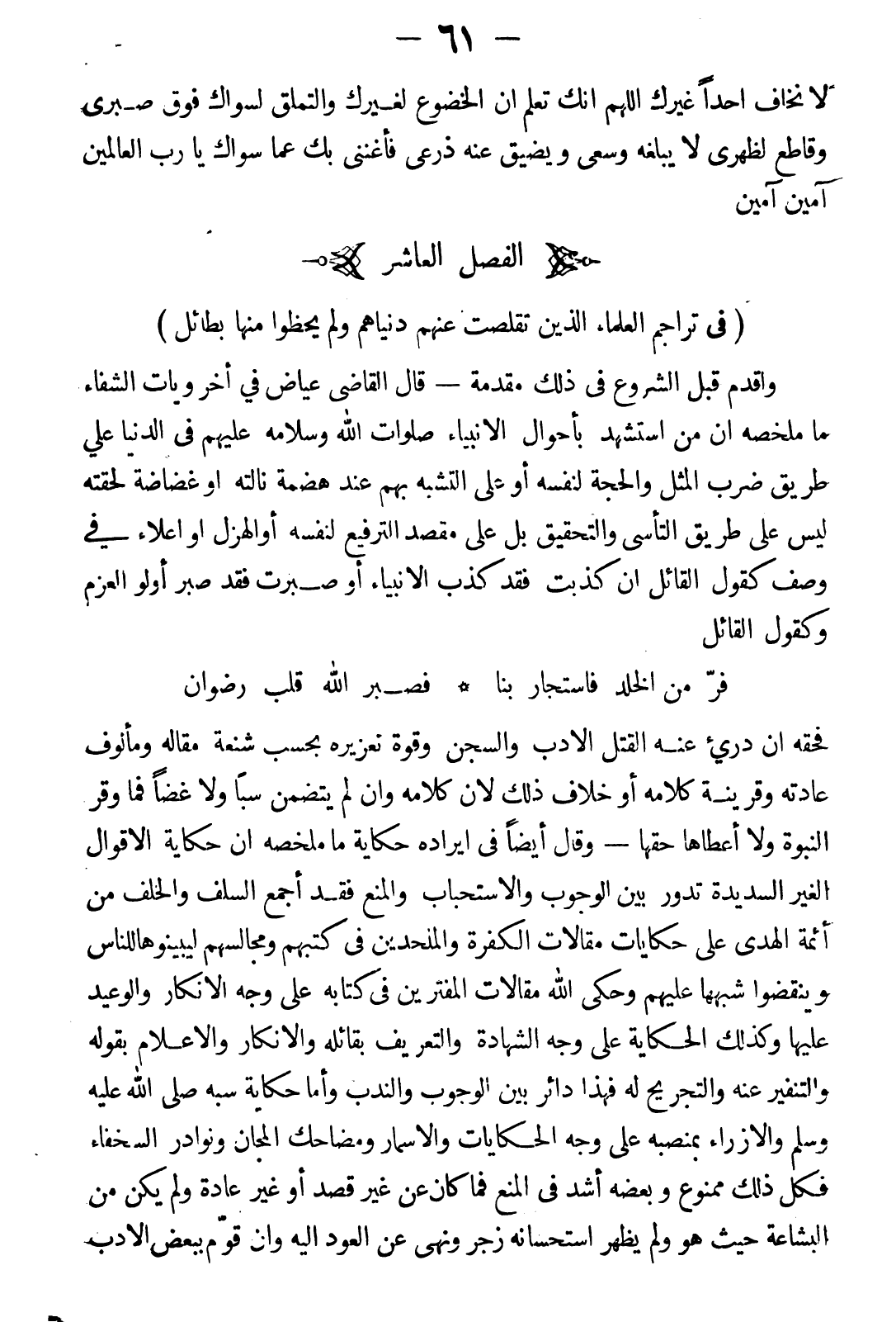 قال القاضي في أخريات الشفاء ما ملخصه: أن من استشهد بأحوال الأنبياء صلوات الله وسلامه عليهم في الدنيا على طريق ضرب المثل والحجة لنفسه أو على التشبه بهم عند هضمة نالته أو غضاضة لحقته ليس على طريق التأسى والتحقيق بل على مقصد الترفيع لنفسه أو الهزل أو إعلاء في وصف، كقول القائل (أن كذبت فقد كذب الأنبياء) أو (صبرت فقد صبر أولو العزم) وكقول قائل: