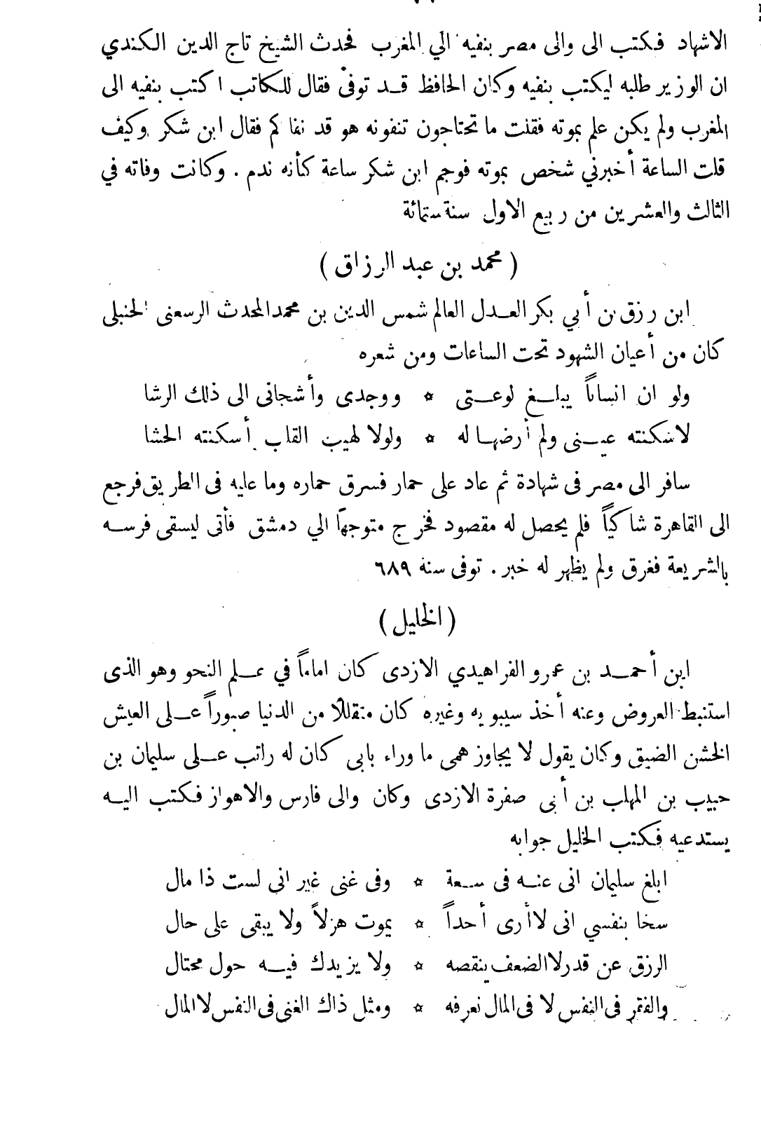 ابن أحمد بن عمرو الفراهيدي الأزدي، كان إماماً في علم النحو، وهو الذي استنبط العروض وعنه أخذ سيبويه وغيره. كان متقللاً من الدنيا صبوراً على العيش الخشن الضيق، وكان يقول لا يجاوز همي ما وراء بابي، كان له راتب علي سليمان بن حبيب بن المهلب بن أبي صفرة الأزدي، وكان والي فارس والأهواز،