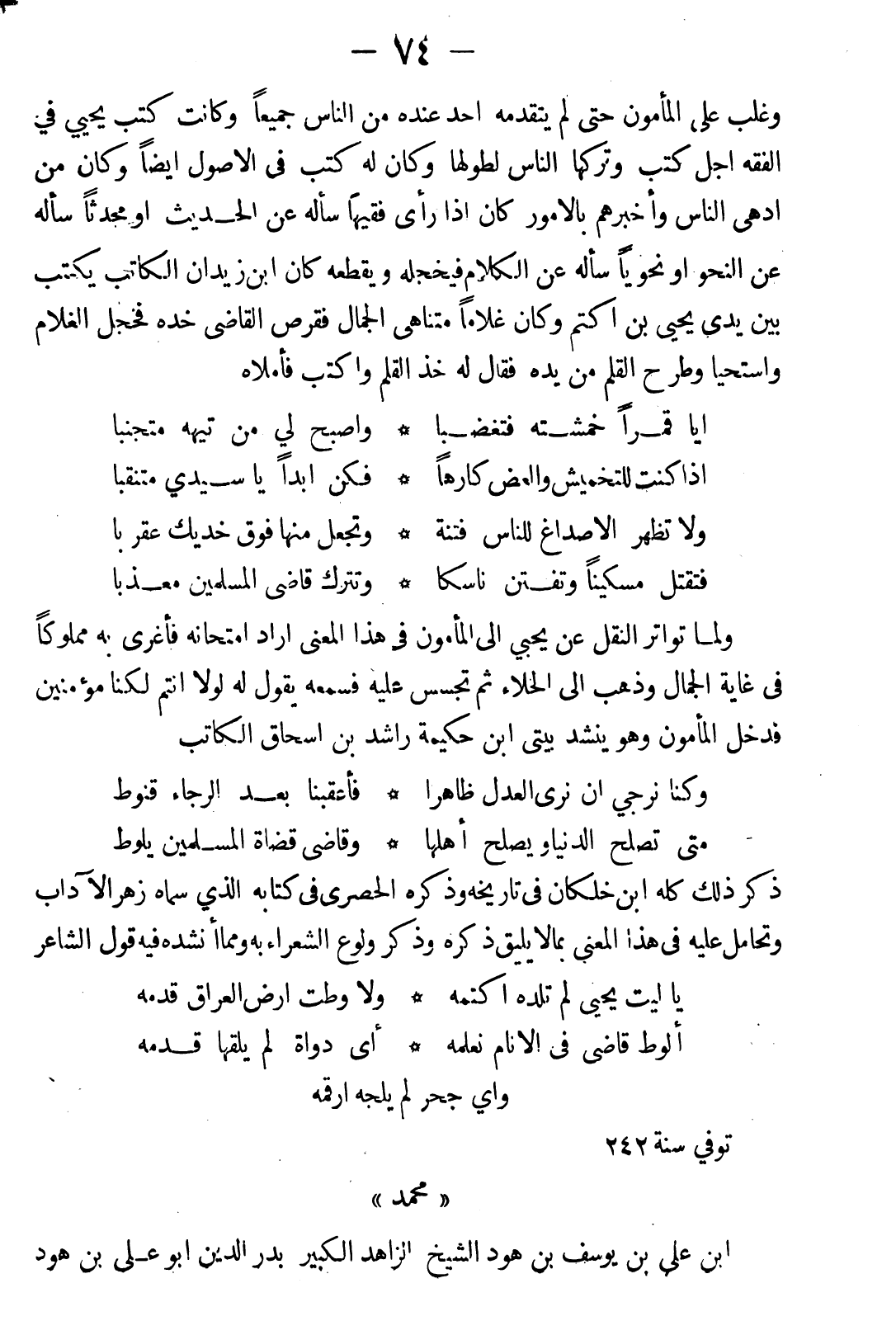 ولما تواتر النقل عن يحيى إلى المأمون في هذا المعنى أراد امتحانه، فأغرى به مملوكاً في غاية الجمال وذهب إلى الخلاء ثم تجسس عليه فسمعه يقول له: لولا انتم لكنا مؤمنين، فدخل المأمون وهو ينشد بيتي ابن حكيمة راشد بن إسحاق الكاتب: