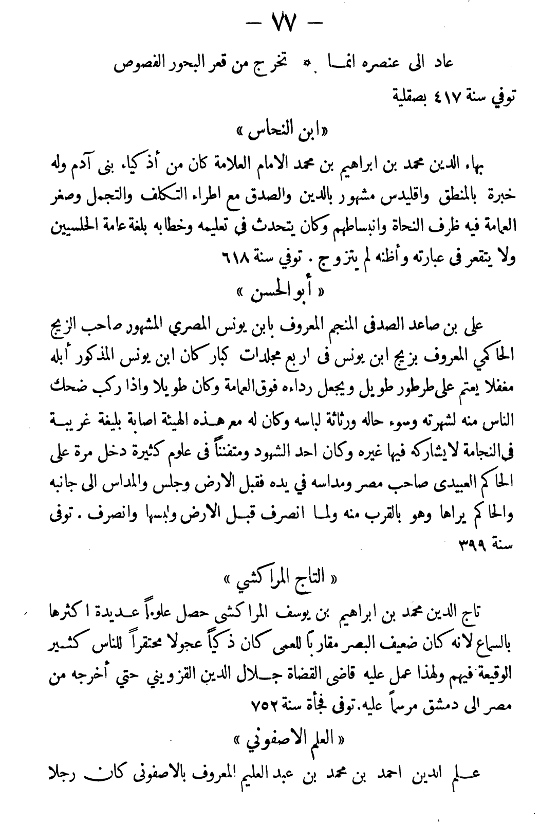 علي بن صاعد الصدفي المنجم المعروف بابن يونس المصري المشهور صاحب الزيج الحاكمي المعروف بزيج ابن يونس في أربع مجلدات كبار كان ابن يونس المذكور أبله مغفلا يعمم على طرطور طويل ويجعل رداءه فوق العمامة، وكان طويلا وإذا ركب ضحك الناس منه لشهرته وسوء حاله ورثاثة لباسه، وكان له مع هذه الهيئة إصابة بليغة غريبة في النجامة لا يشاركه فيها غيره، وكان أحد الشهود ومتفننا في علوم كثيرة. دخل مرة على الحاكم العبيدي صاحب مصر ومداسه في يده فقبل الأرض وجلس والمداس إلى جانبه والحاكم يراها وهو