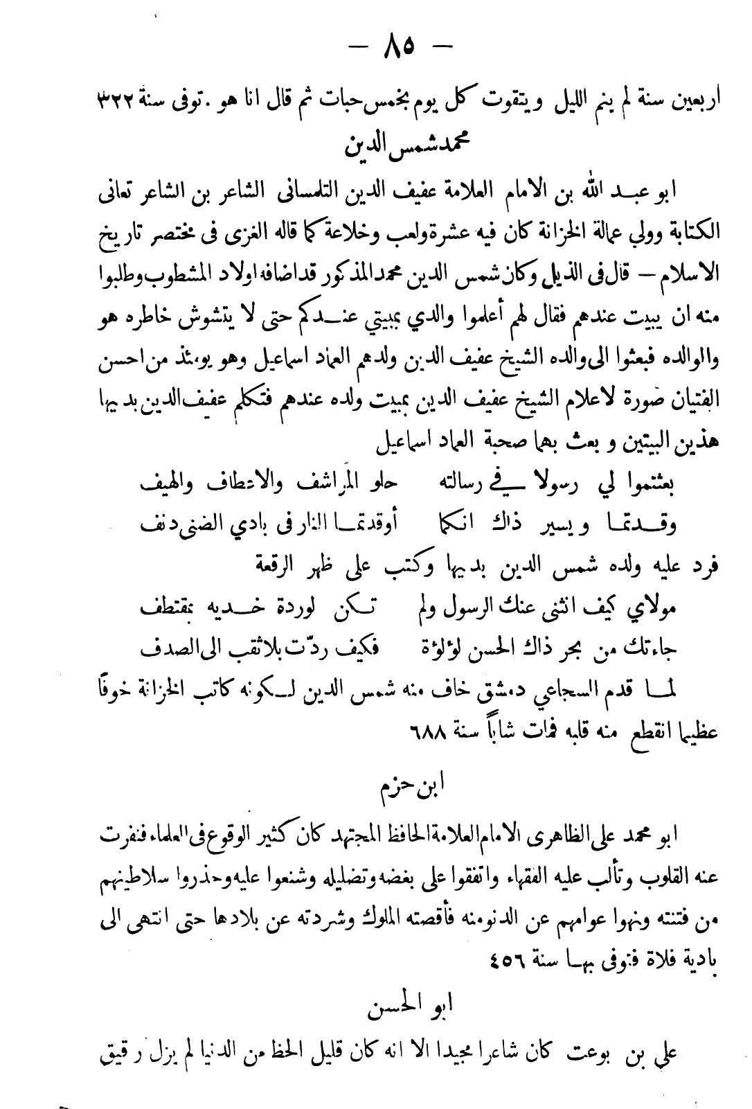 أبو محمد علي الظاهري، الإمام العلامة الحافظ المجتهد. كان كثير الوقوع في العلماء فنفرت عنه القلوب وتألب عليه الفقهاء واتفقوا على بغضه وتضليله وشنعوا عليه وحذروا سلاطينهم من فتنته ونهوا عوامهم عن الدنو منه، فأقصته الملوك وشردته عن بلادها حتى انتهى إلى بادية فلاة فتوفي بها سنة 456.