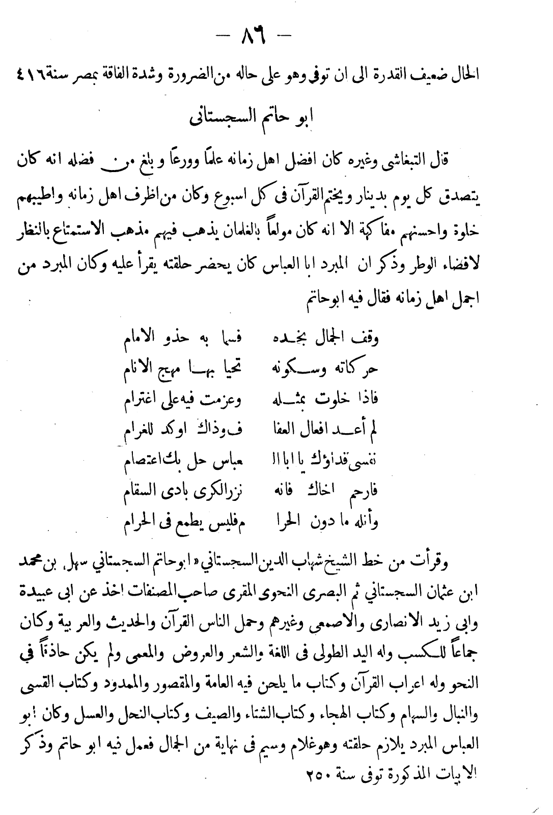 وقرأت من خط الشيخ شهاب الدين السجستاني: أبو حاتم السجستاني سهل بن محمد ابن عثمان السجستاني ثم البصري النحوي المقرئ صاحب المصنفات، أخذ عن أبي عبيدة وأبي زيد الأنصاري والأصمعي وغيرهم، وحمل الناس القرآن والحديث والعربية، وكان جماعا للكتب وله اليد الطولي في اللغة والشعر والعروض والمعمى، ولم يكن حاذقا في النحو. وله إعراب القرآن، وكتاب ما يلحن فيه العامة، والمقصور والممدود، وكتاب القسي والنبال والسهام، وكتاب الهجاء، وكتاب الشتاء والصيف، وكتاب النحل والعسل. كان أبو العباس المبرد يلازم حلقته وهو غلام وسيم في نهاية من الجمال، فعمل فيه أبو حاتم. . . وذكر الأبيات المذكورة. توفي سنة 250.