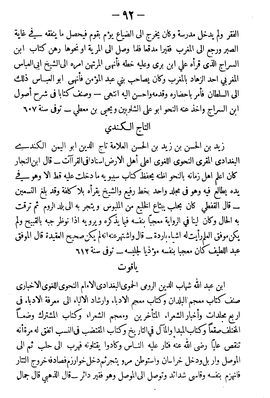 في يده يطالع فيه، وهو في مجلد واحد بخط رفيع. والشيخ يقرأه بلا كلفة وقد بلغ التسعين. قال القفطي: كان بحلب يبتاع الخليع من الملبوس ويتجر به إلى بلد الروم. ثم ترقت به الحال وكان لينا في الرواية معجبا بنفسه فيما يذكره ويرويه، إذا نواظر جبه بالقبيح ولم يكن موفق العلم. رأيت له أشياء باردة. قال: واشتهر عنه إنه لم يكن صحيح العقيدة. قال الموفق عبد اللطيف: كان معجبا بنفسه مؤذيا لجليسه. توفي سنة 612.