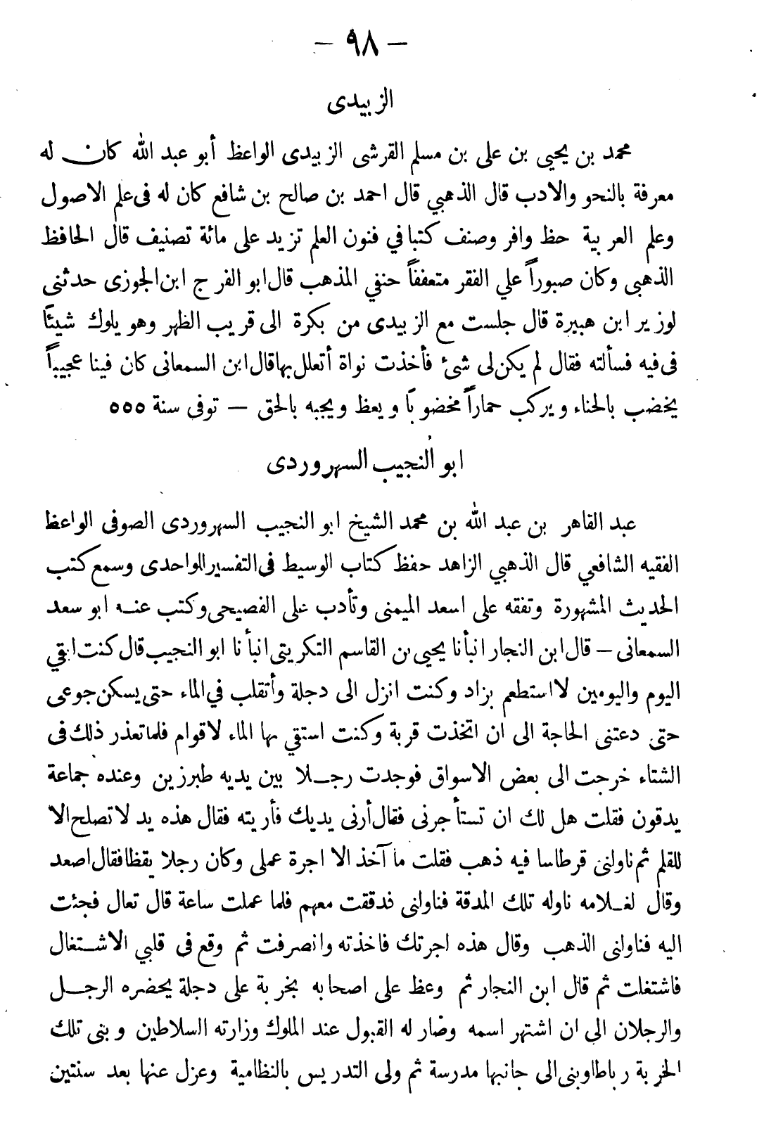 عبد القاهر بن عبد الله بن محمد الشيخ أبو النجيب السهر وردي الصوفي الواعظ الفقيه الشافعي. قال الذهبي: الزاهد حفظ كتاب الوسيط في التفسير للواحدي وسمع كتب الحديث المشهورة وتفقه على اسعد الميمنى وتأدب على الفصيحى وكتب عنه أبو سعد السمعاني. قال ابن النجار: أنبأنا يحيى بن القاسم التكريتي أنبأنا أبو