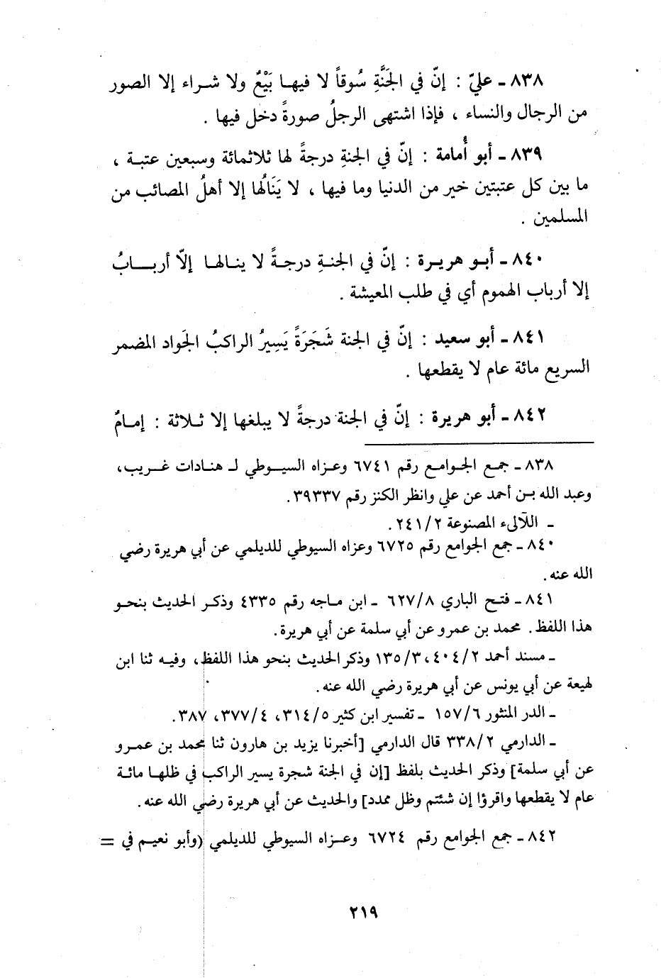 838 - عَليّ إِن فِي الْجنَّة سوقا لَا فِيهَا بيع وَلَا شِرَاء إِلَّا الصُّور من الرِّجَال وَالنِّسَاء فَإِذا اشْتهى الرجل صُورَة دخل فِيهَا