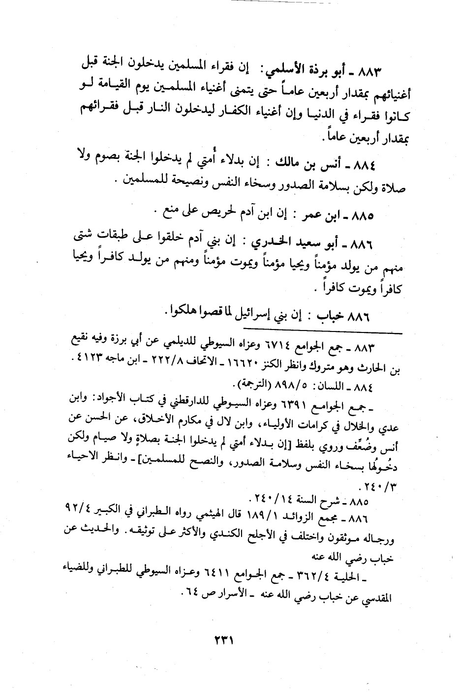 إِن فُقَرَاء الْمُسلمين يدْخلُونَ الْجنَّة قبل أغنيائهم بِمِقْدَار أَرْبَعِينَ عَاما حَتَّى يتَمَنَّى أَغْنِيَاء الْمُسلمين يَوْم الْقِيَامَة لَو كَانُوا فِي الدُّنْيَا وَإِن أَغْنِيَاء الْكفَّار ليدخلون النَّار قبل فقرائهم بِمِقْدَار أَرْبَعِينَ عَاما