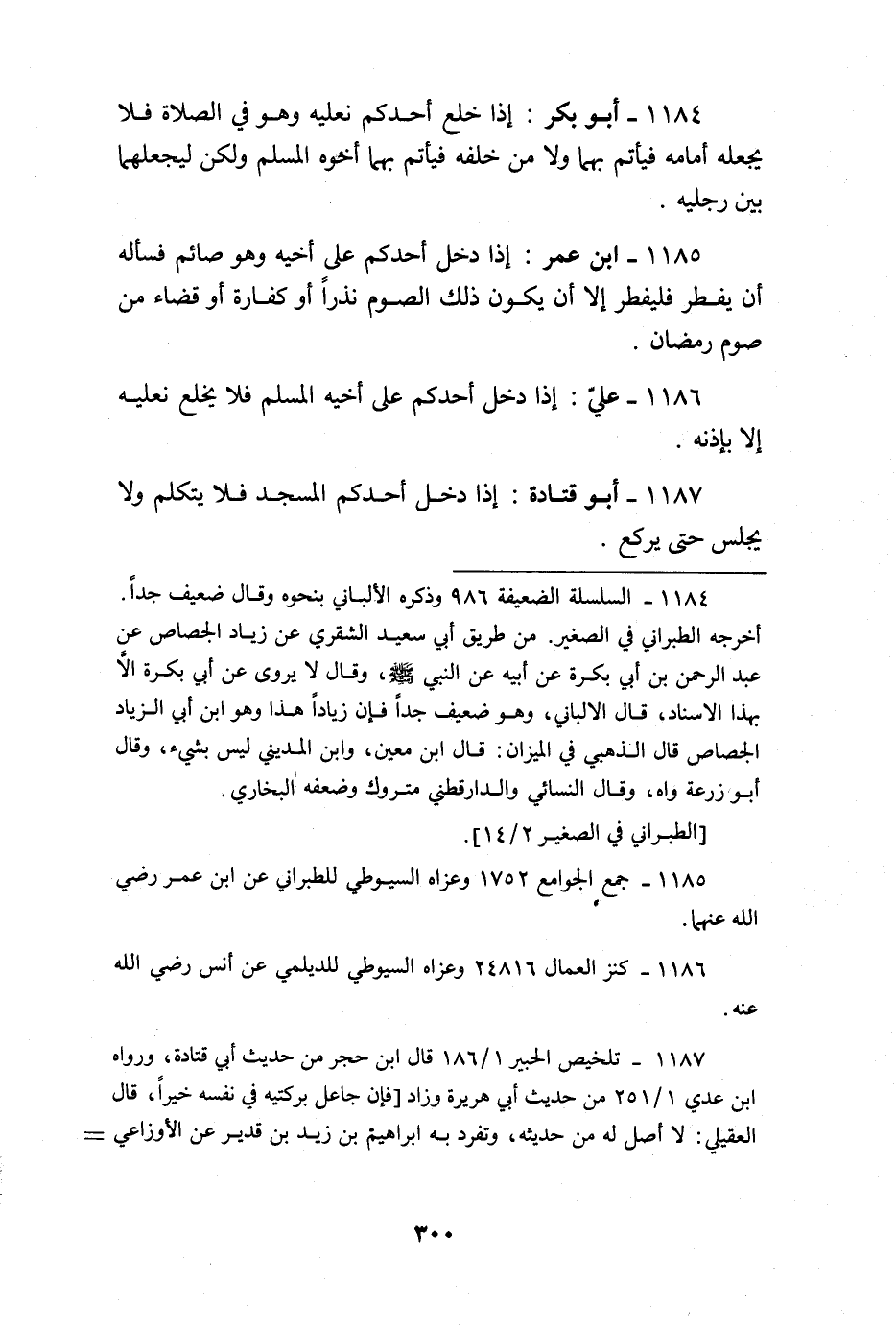 1184 - أَبُو بكر إِذا خلع أحدكُم نَعْلَيْه وَهُوَ فِي الصَّلَاة فَلَا يَجعله أَمَامه فيأتم بهما وَلَا من خَلفه فيأتم بهما أَخُوهُ الْمُسلم وَلَكِن ليجعلها بَين رجلَيْهِ