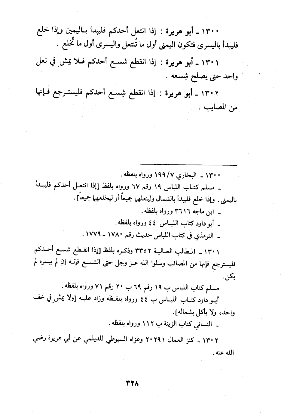 إِذا انتعل أحدكُم فليبدأ بِالْيَمِينِ وَإِذا خلع فليبدأ باليسرى فَتكون الْيُمْنَى أول مَا تنتعل واليسرى أول مَا تخلع