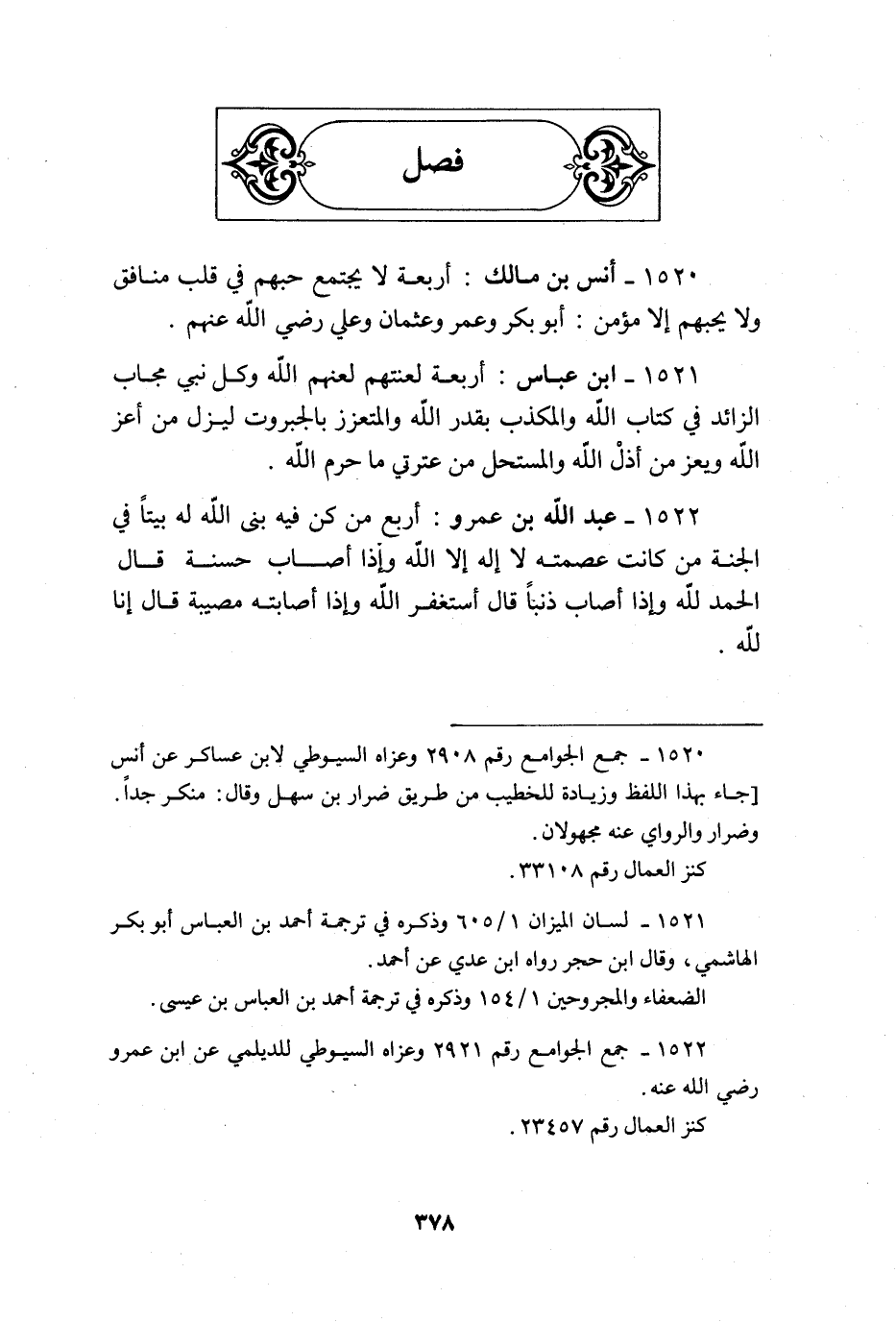 أَرْبَعَة لَا يجْتَمع حبهم فِي قلب مُنَافِق وَلَا يُحِبهُمْ إِلَّا مُؤمن أَبُو بكر وَعمر وَعُثْمَان وَعلي رَضِي الله عَنْهُم