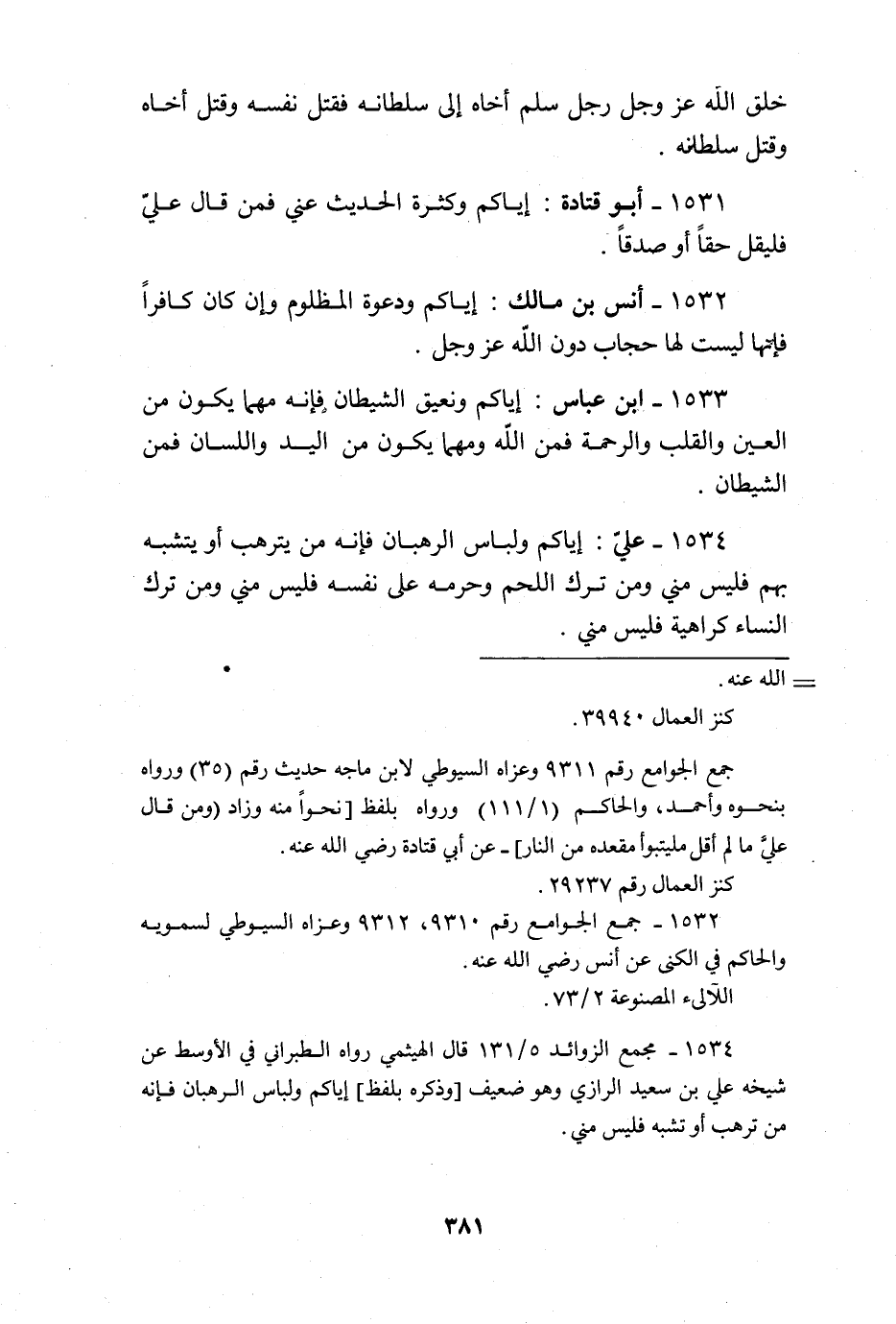 إيَّاكُمْ ولباس الرهبان فَإِنَّهُ من يترهب أَو يتشبه بهم فَلَيْسَ مني وَمن ترك اللَّحْم وَحرمه على نَفسه فَلَيْسَ مني وَمن ترك النِّسَاء كَرَاهِيَة فَلَيْسَ مني