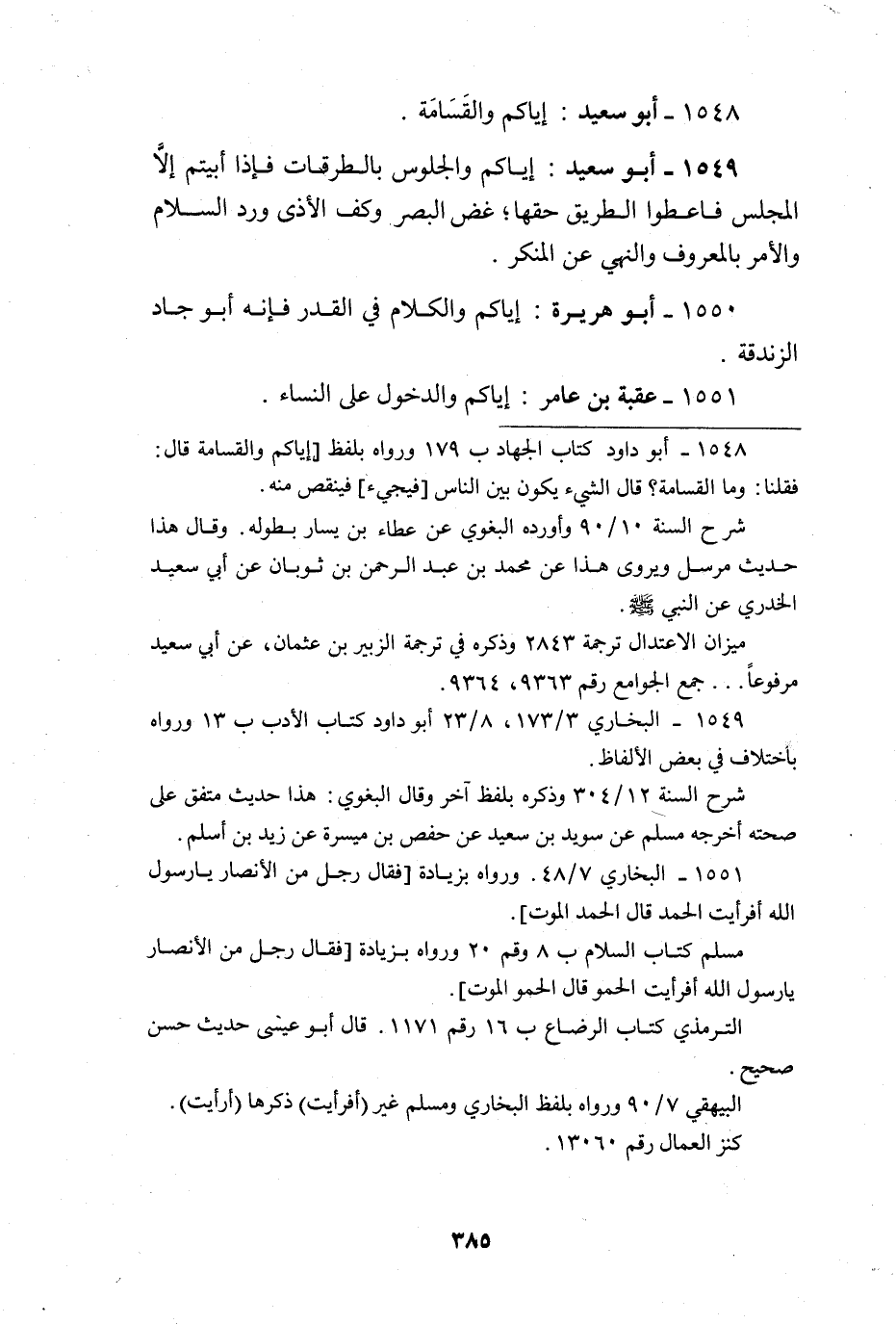 إيَّاكُمْ وَالْجُلُوس بالطرقات فَإِذا أَبَيْتُم إِلَّا الْمجْلس فاعطوا الطَّرِيق حَقّهَا غض الْبَصَر وكف الْأَذَى ورد السَّلَام وَالْأَمر بِالْمَعْرُوفِ وَالنَّهْي عَن الْمُنكر