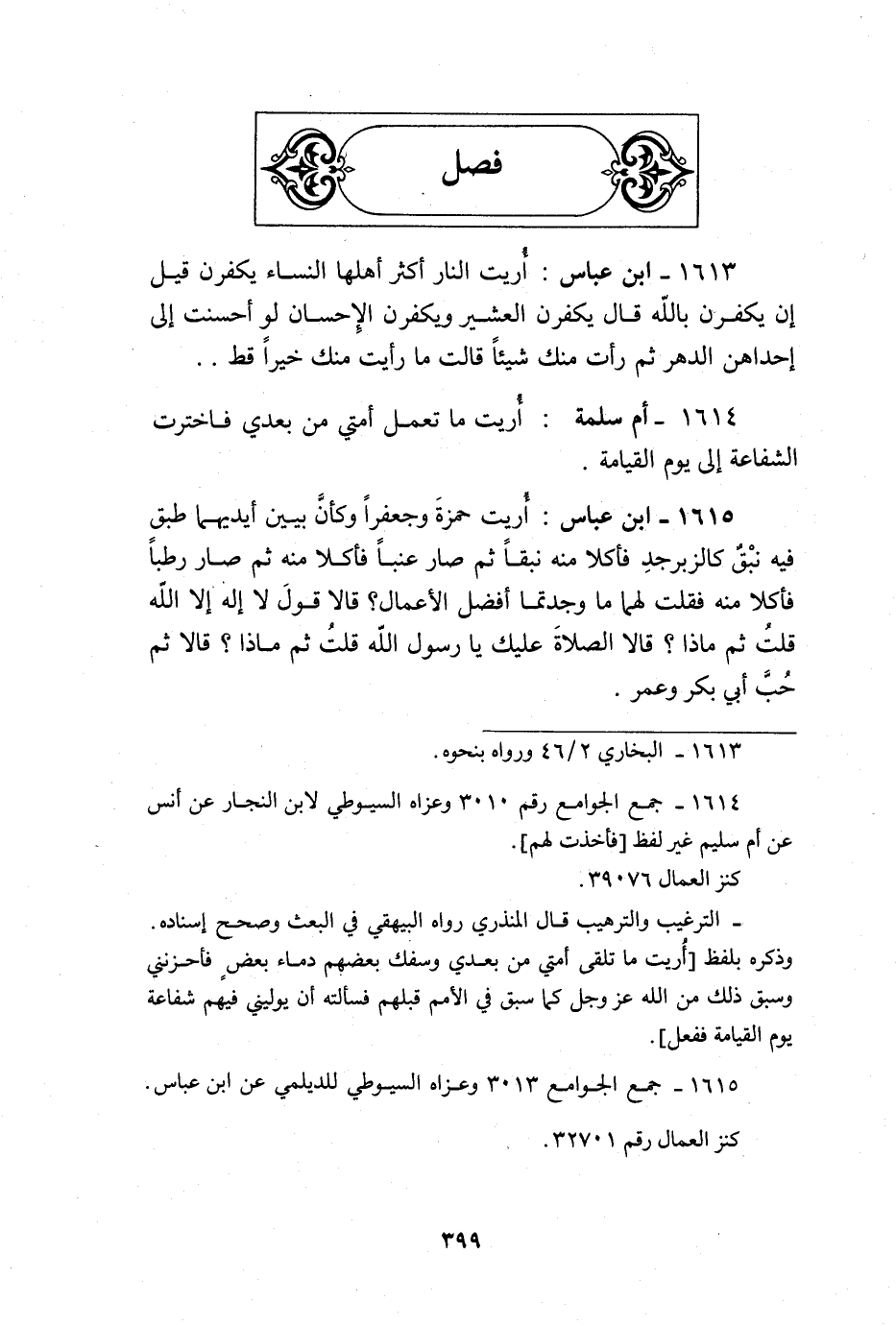 أريت النَّار أَكثر أَهلهَا النِّسَاء يكفرن قيل إِن يكفرن بِاللَّه قَالَ يكفرن العشير ويكفرن الْإِحْسَان لَو أَحْسَنت إِلَى إِحْدَاهُنَّ الدَّهْر ثمَّ رَأَتْ مِنْك شَيْئا قَالَت مَا رَأَيْت مِنْك خيرا قطّ
