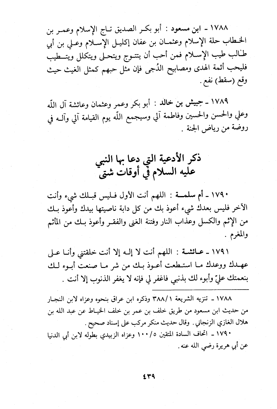 أَبُو بكر الصّديق تَاج الْإِسْلَام وَعمر بن الْخطاب حلَّة الْإِسْلَام وَعُثْمَان بن عَفَّان إكليل الْإِسْلَام وَعلي بن أبي طَالب طيب الْإِسْلَام فَمن أحب أَن يتتوج ويتحلى ويتكلل ويتطيب فليحب أَئِمَّة الْهدى ومصابيح الدجى فَإِن مثل حبهم كَمثل الْغَيْث حَيْثُ وَقع سقط نفع