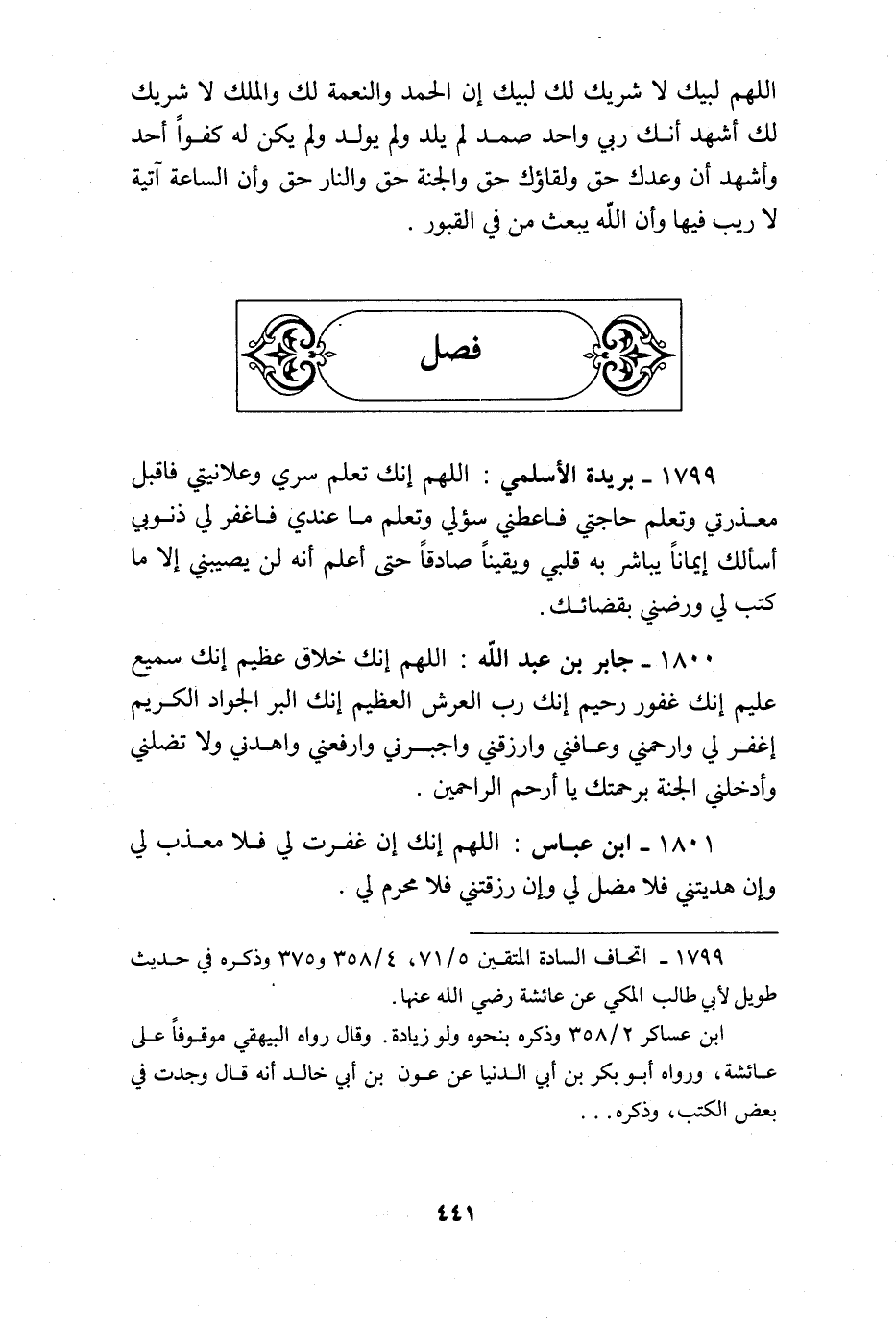 اللَّهُمَّ لبيْك لَا شريك لَك لبيْك إِن الْحَمد وَالنعْمَة لَك وَالْملك لَا شريك لَك أشهد أَنَّك رَبِّي وَاحِد صَمد لم يلد وَلم يُولد وَلم يكن لَهُ كفوا أحد وَأشْهد أَن وَعدك حق ولقاؤك حق وَالْجنَّة حق وَالنَّار حق وَأَن السَّاعَة آتِيَة لَا ريب فِيهَا وَأَن الله يبْعَث من فِي الْقُبُور