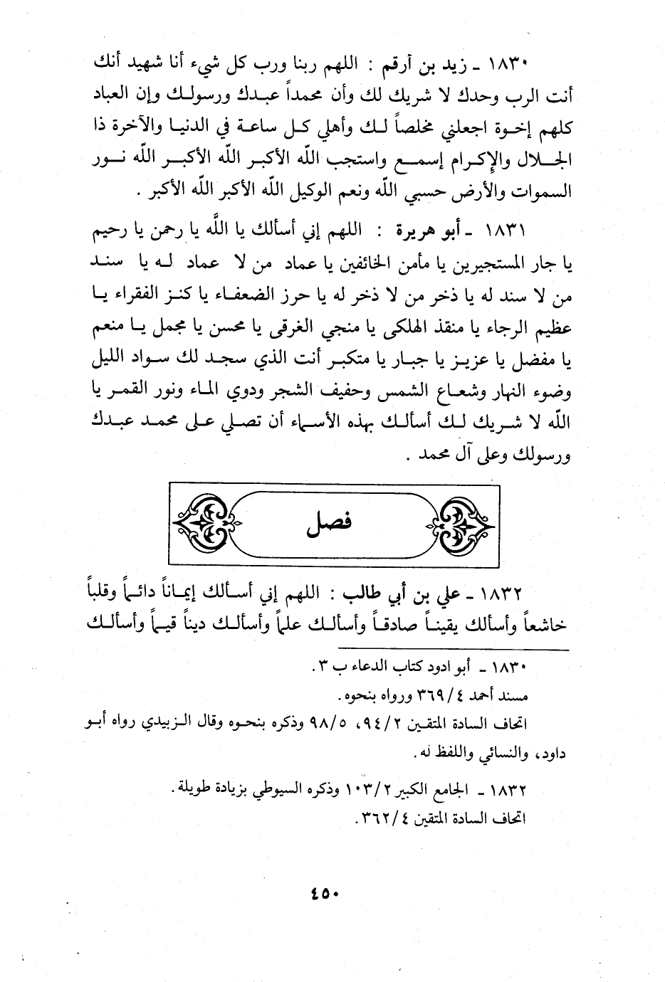 اللَّهُمَّ إِنِّي أَسأَلك إِيمَانًا دَائِما وَقَلْبًا خَاشِعًا وَأَسْأَلك يَقِينا صَادِقا وَأَسْأَلك علما وَأَسْأَلك دينا قيمًا وَأَسْأَلك