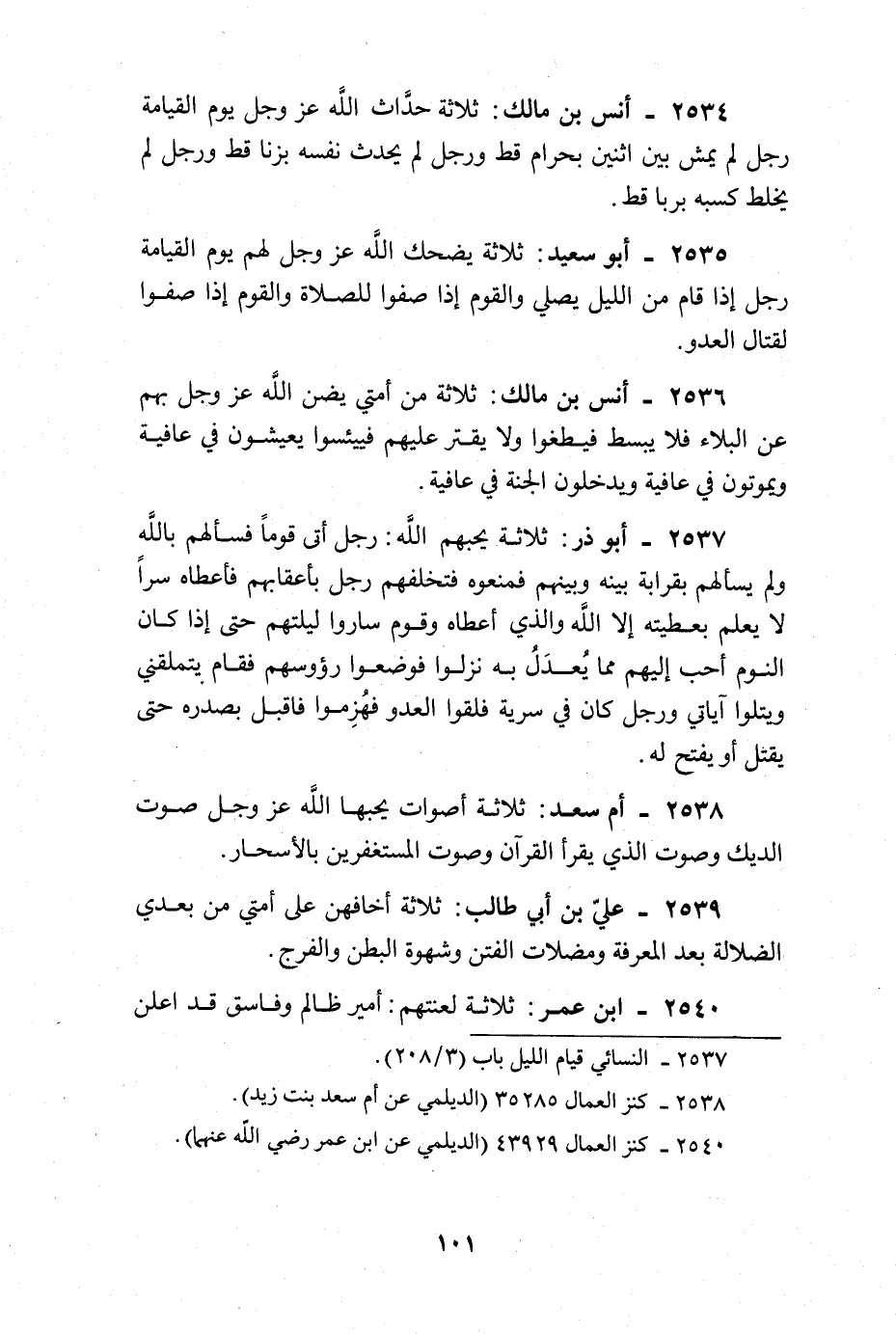 ثَلَاثَة حداث الله عز وَجل يَوْم الْقِيَامَة رجل لم يمش بَين اثْنَيْنِ بِحرَام قطّ وَرجل لم يحدث نَفسه بزنا قطّ وَرجل لم يخلط كَسبه بربا قطّ