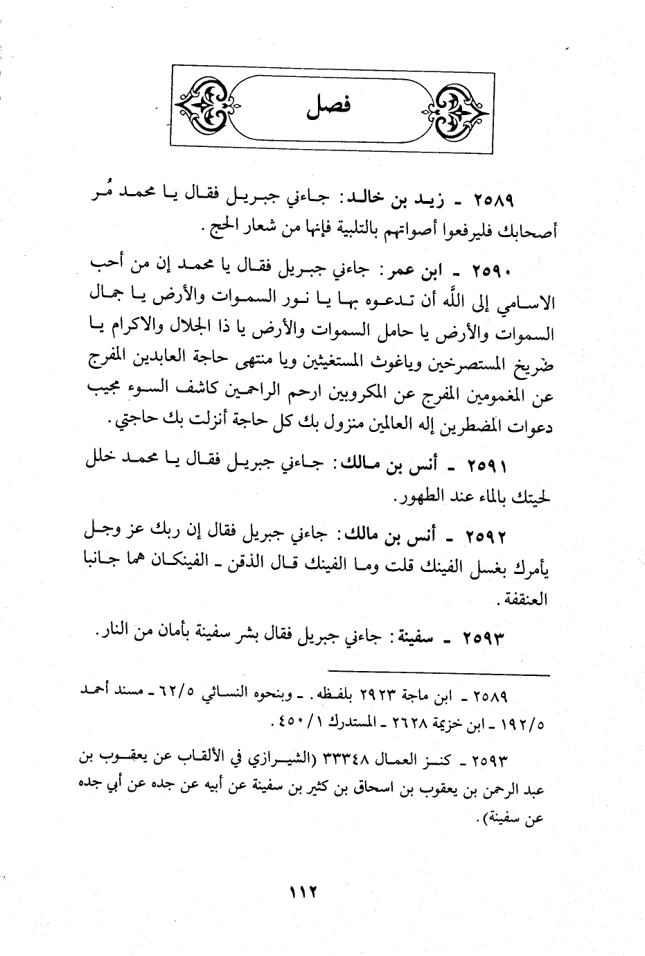 جَاءَنِي جِبْرِيل فَقَالَ يَا مُحَمَّد إِن من أحب الاسامي إِلَى الله أَن تَدعُوهُ بهَا يَا نور السَّمَوَات وَالْأَرْض يَا جمال السَّمَوَات وَالْأَرْض يَا حَامِل السَّمَوَات وَالْأَرْض يَا ذَا الْجلَال والاكرام يَا ضريخ المستصرخين وَيَا غوث المستغيثين وَيَا مُنْتَهى حَاجَة العابدين المفرج عَن المغمومين المفرج عَن المكروبين ارْحَمْ الرَّاحِمِينَ كاشف السوء مُجيب دعوات الْمُضْطَرين إِلَه الْعَالمين منزول بك كل حَاجَة أنزلت بك حَاجَتي