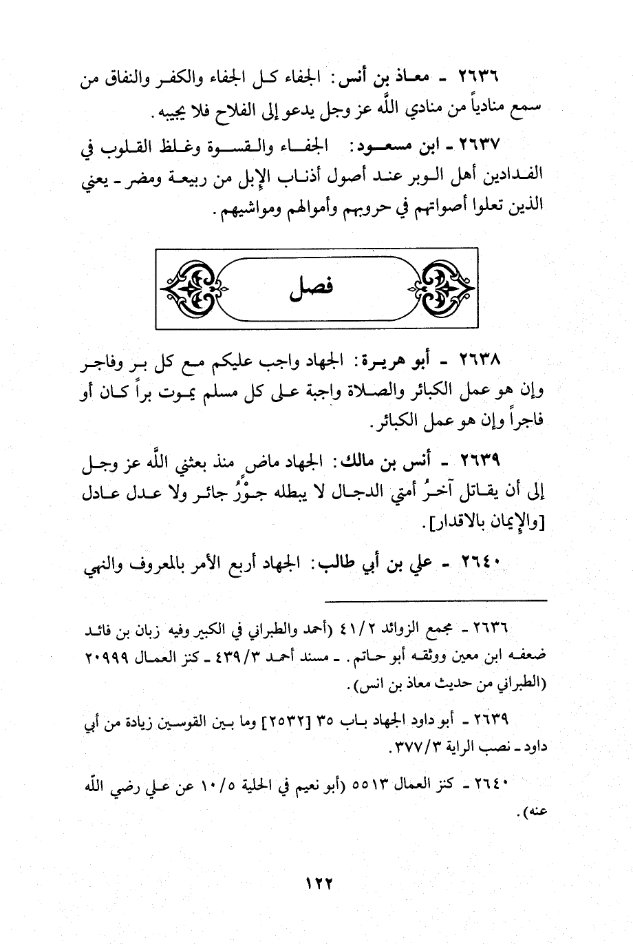 الْجِهَاد مَاض مُنْذُ بَعَثَنِي الله عز وَجل إِلَى أَن يُقَاتل آخر أمتِي الدَّجَّال لَا يُبطلهُ جور جَائِر وَلَا عدل عَادل وَالْإِيمَان بالاقدار