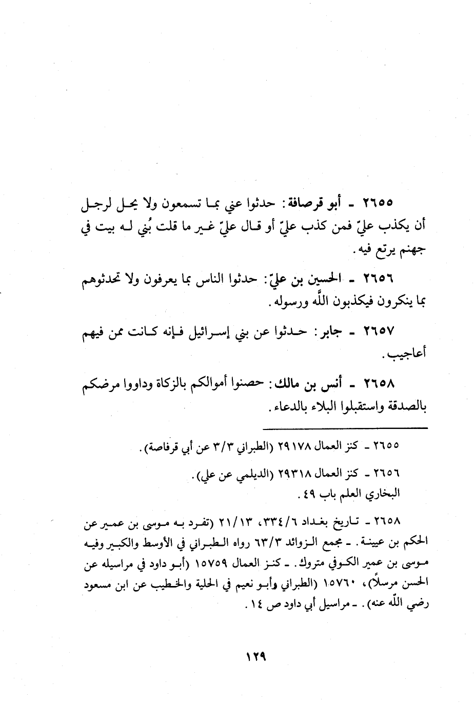 حدثوا عني بِمَا تَسْمَعُونَ وَلَا يحل لرجل أَن يكذب عَليّ فَمن كذب عَليّ أَو قَالَ عَليّ غير مَا قلت بني لَهُ بَيت فِي جَهَنَّم يرتع فِيهِ
