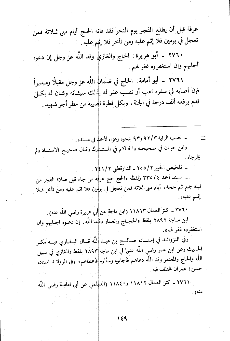 الْحَاج فِي ضَمَان الله عز وَجل مُقبلا ومدبرا فَإِن أَصَابَهُ فِي سَفَره تَعب أَو نصب غفر لَهُ بذلك سيئاته وَكَانَ لَهُ بِكُل قدم يرفعهُ ألف دَرَجَة فِي الْجنَّة وَبِكُل قَطْرَة تصيبه من مطر أجر شَهِيد