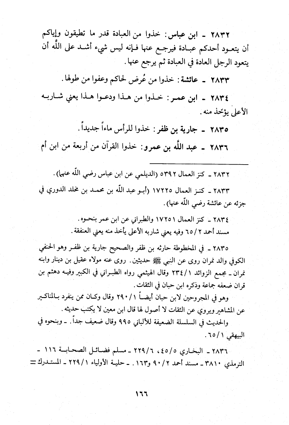 خُذُوا من الْعِبَادَة قدر مَا تطيقون وَإِيَّاكُم أَن يتعود أحدكُم عبَادَة فَيرجع عَنْهَا فَإِنَّهُ لَيْسَ شَيْء أَشد على الله أَن يتعود الرجل الْعَادة فِي الْعِبَادَة ثمَّ يرجع عَنْهَا