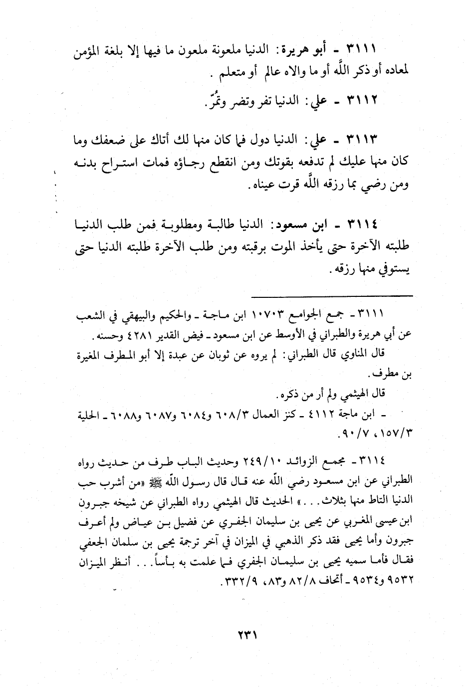 الدُّنْيَا ملعونة مَلْعُون مَا فِيهَا إِلَّا بلغَة الْمُؤمن لمعاده أَو ذكر الله أَو مَا وَالَاهُ عَالم أَو متعلم