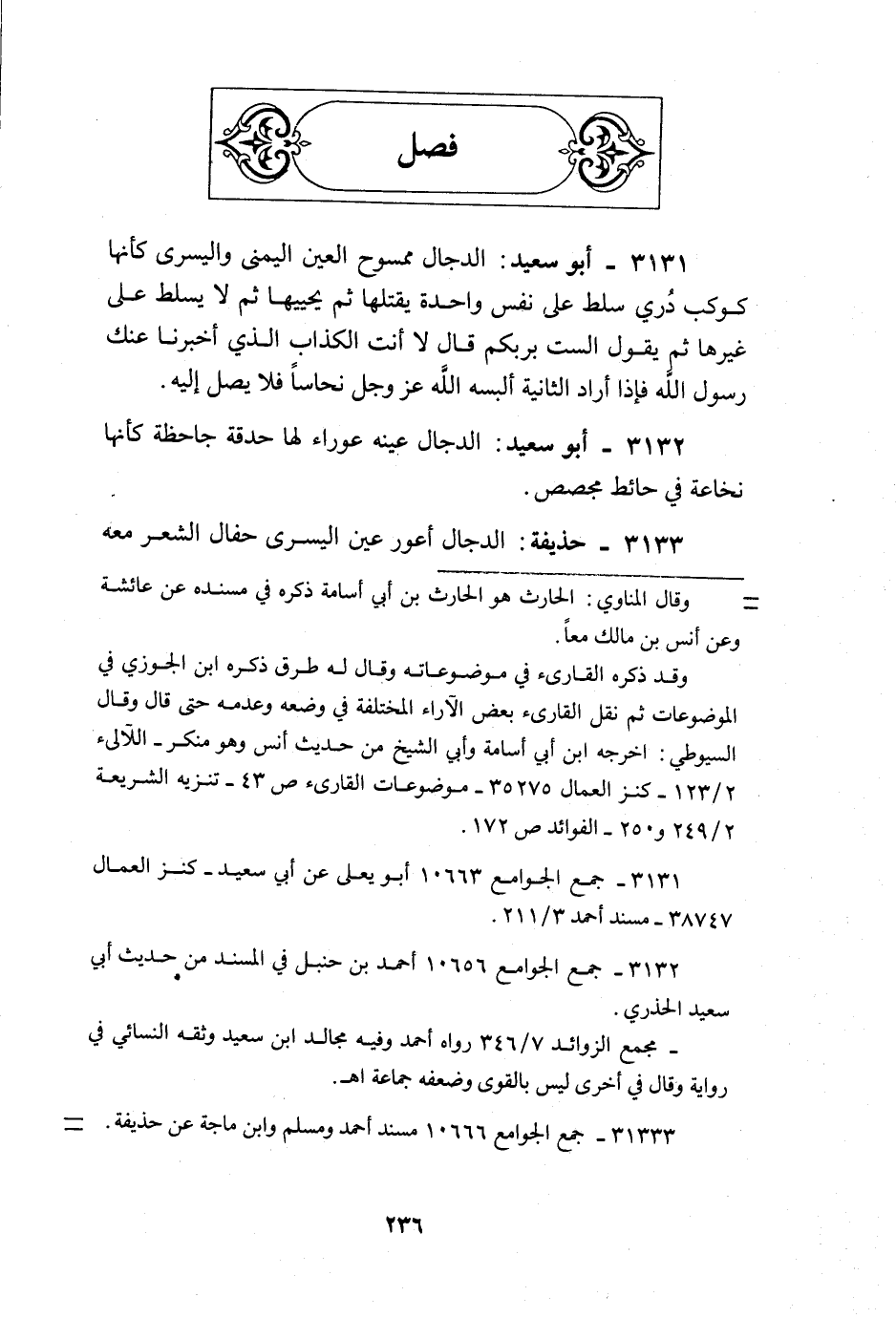 الدَّجَّال مَمْسُوح الْعين الْيُمْنَى واليسرى كَأَنَّهَا كَوْكَب دري سلط على نفس وَاحِدَة يَقْتُلهَا ثمَّ يُحْيِيهَا ثمَّ لَا يُسَلط على غَيرهَا ثمَّ يَقُول السِّت بربكم قَالَ لَا أَنْت الْكذَّاب الَّذِي أخبرنَا عَنْك رَسُول الله فَإِذا أَرَادَ الثَّانِيَة ألبسهُ الله عز وَجل نُحَاسا فَلَا يصل إِلَيْهِ